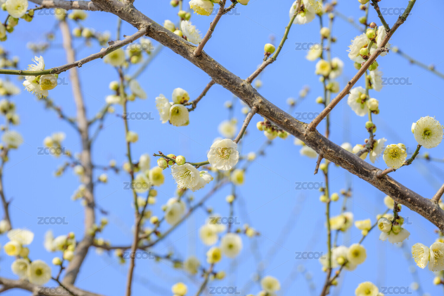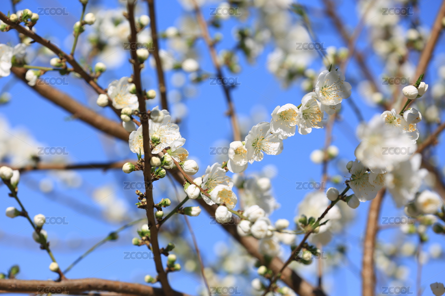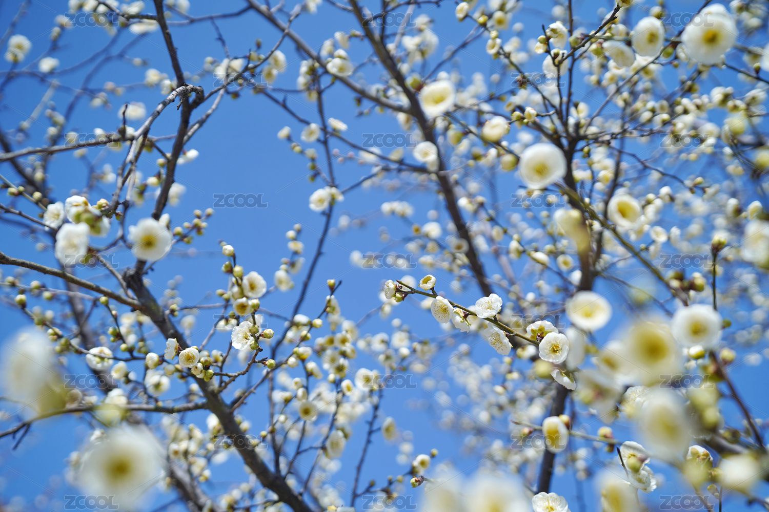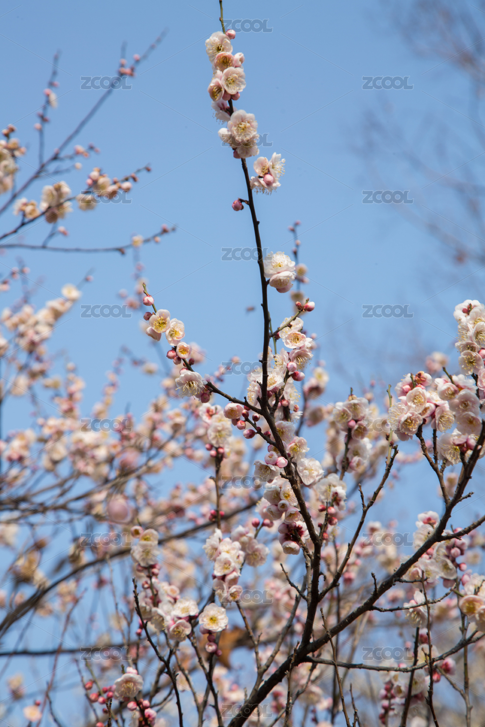 蓝色天空背景下的梅花白梅盛开特写