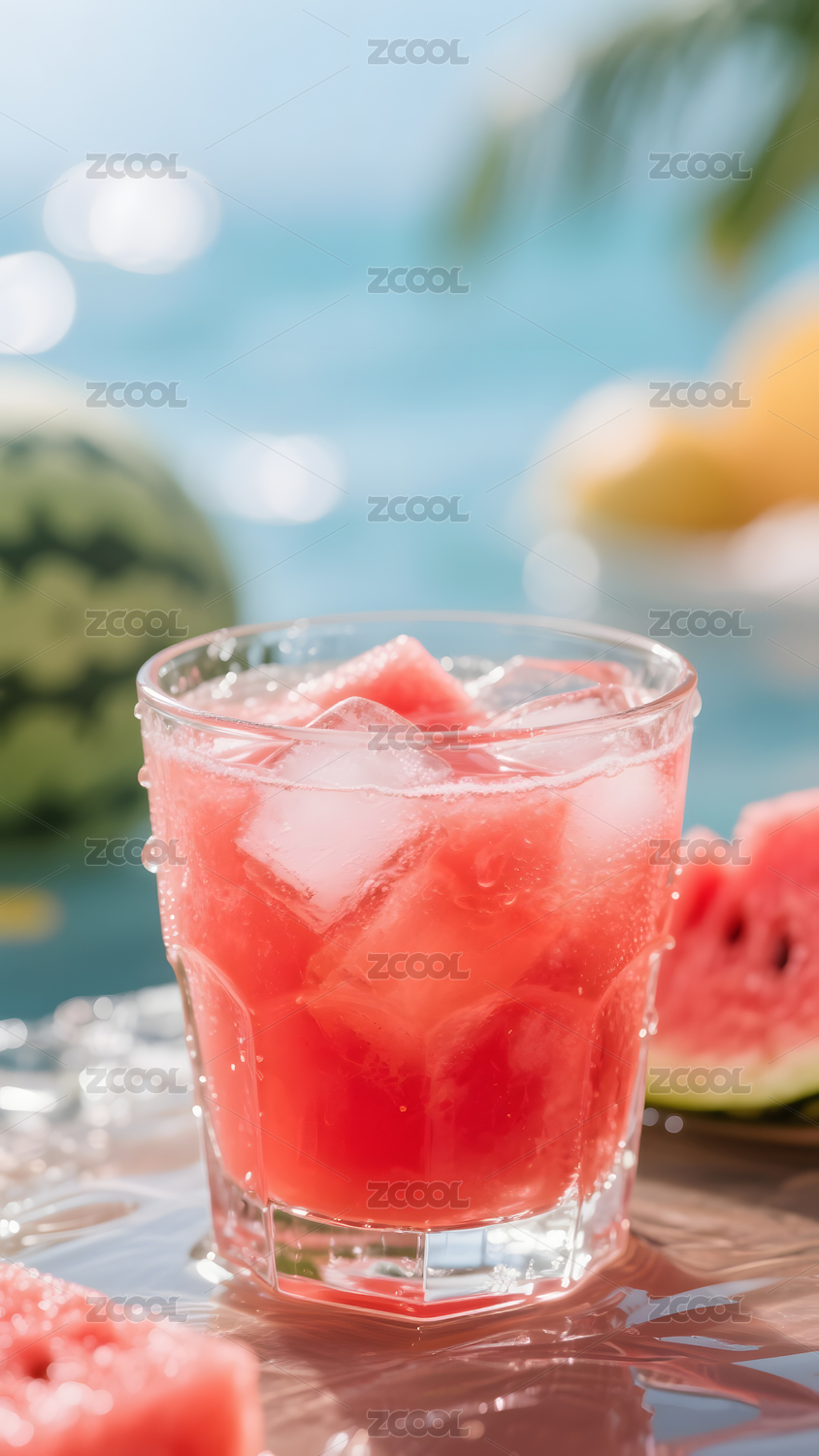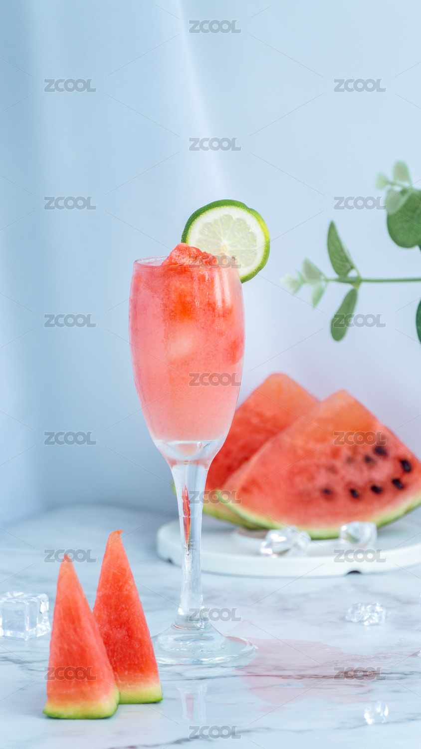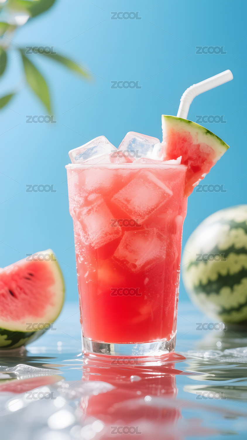 蓝色背景上的一杯夏天果汁饮品西瓜汁特写