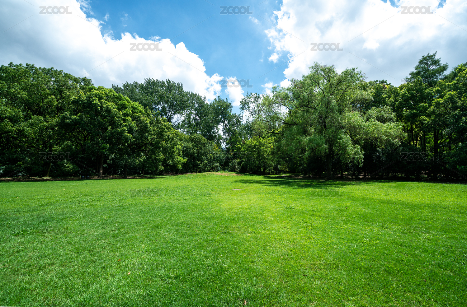 蓝天白云下树林与绿草坪绿草地