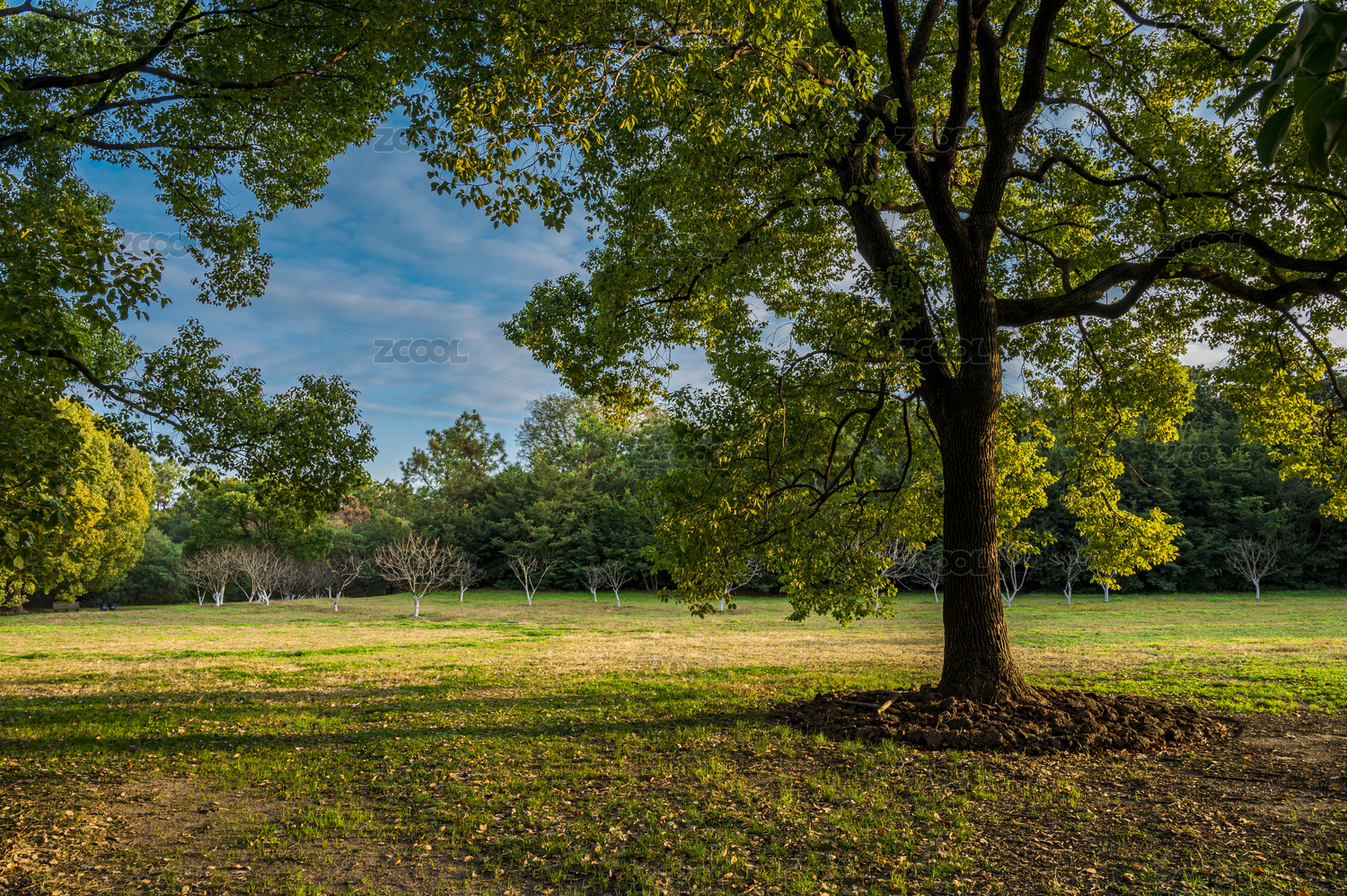春天阳光照射下的树林草坪