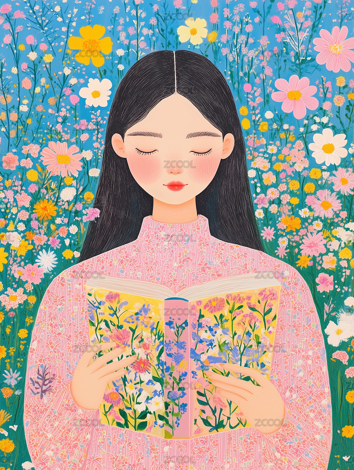 女孩书本花丛场景展示