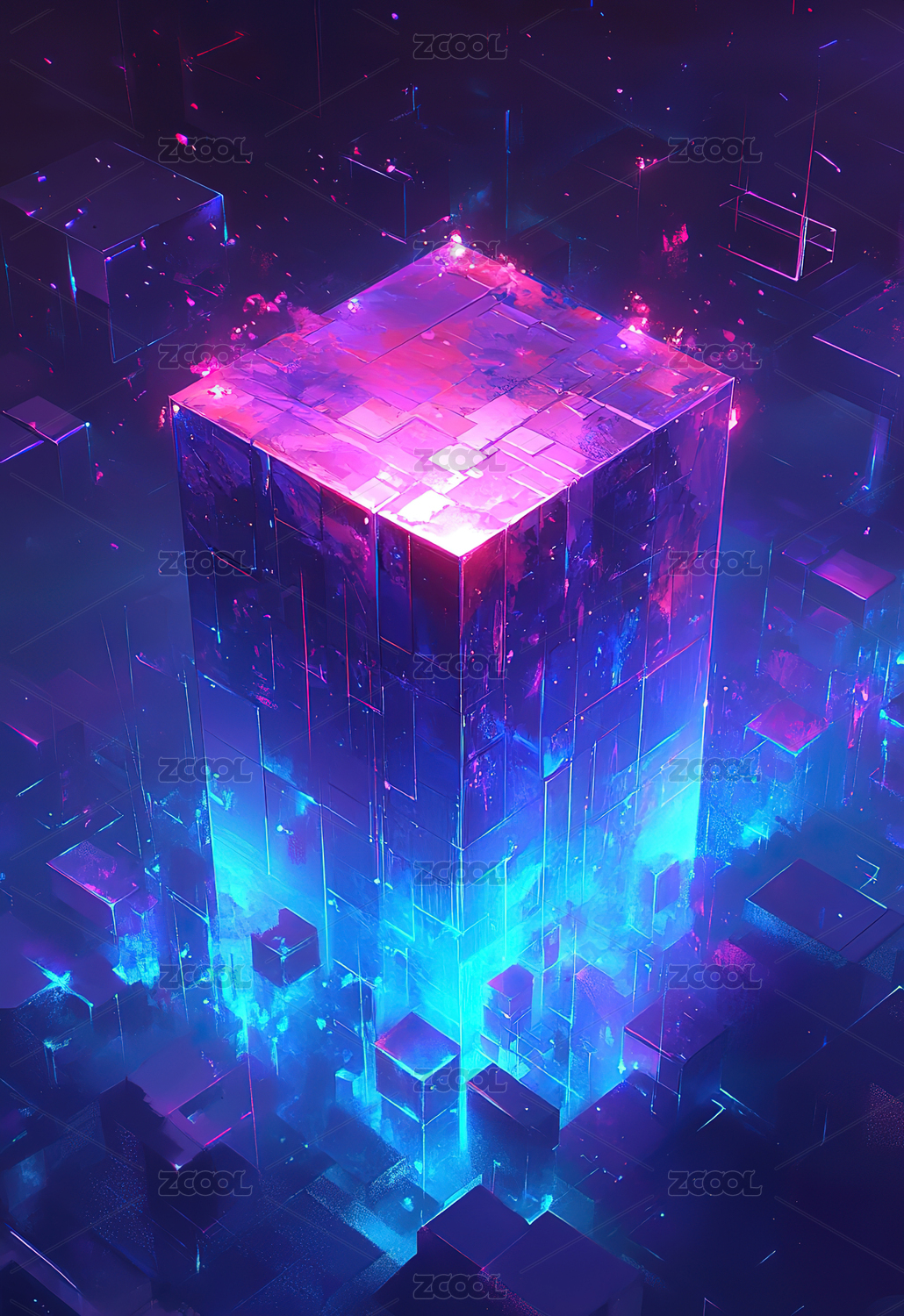 科幻彩色透明荧光色魔方存储器3D赛博插画