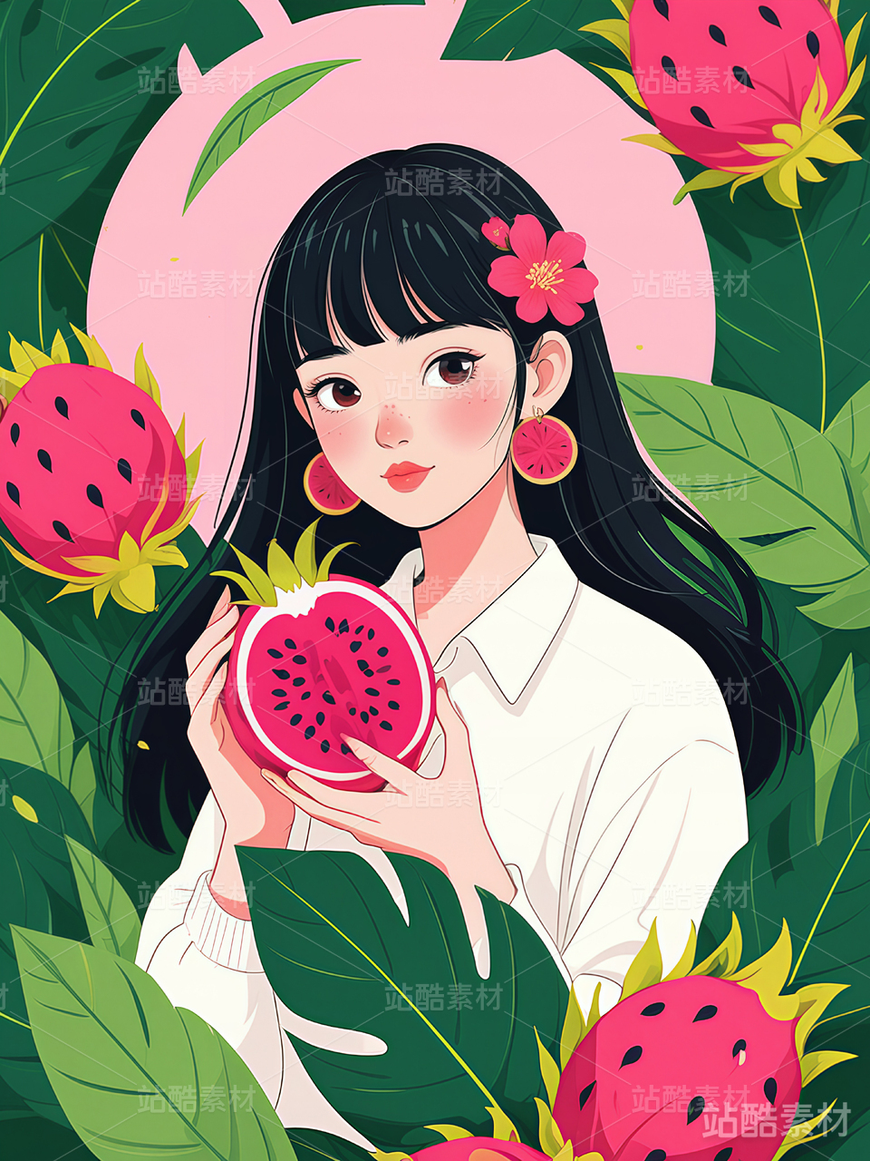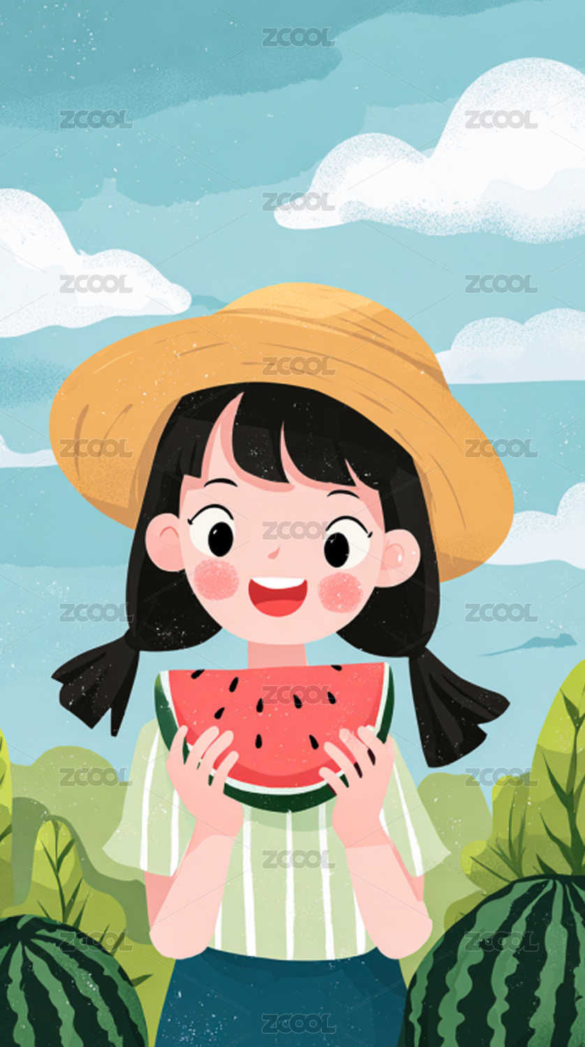 一个可爱的小女孩吃西瓜绿叶夏季插画