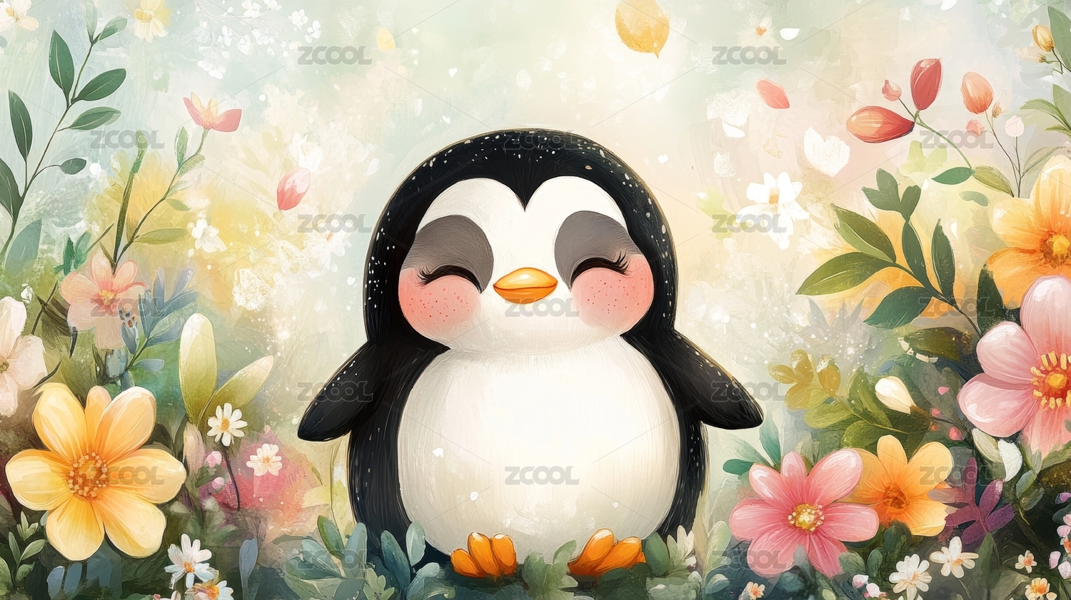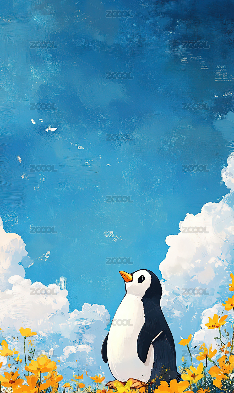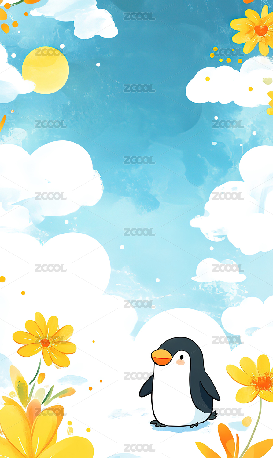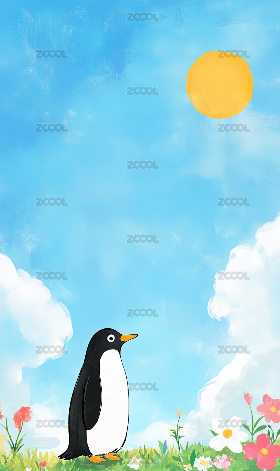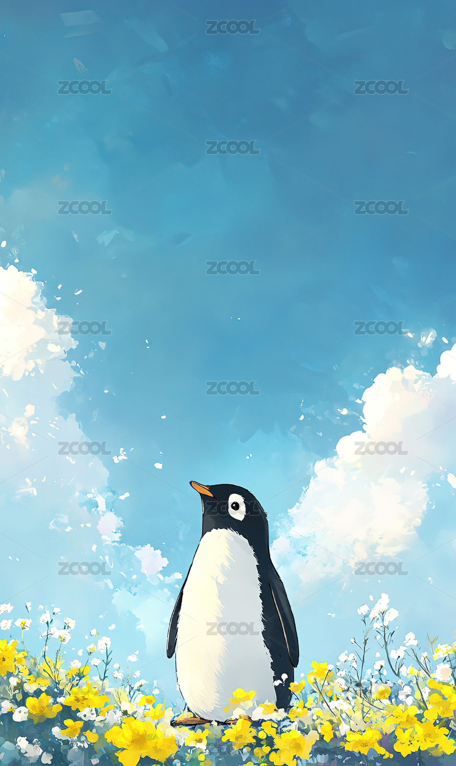 小清新企鹅花海天空插画