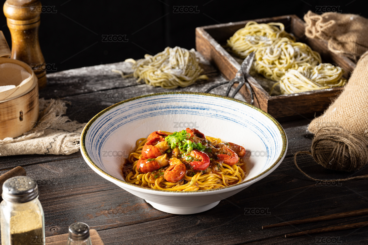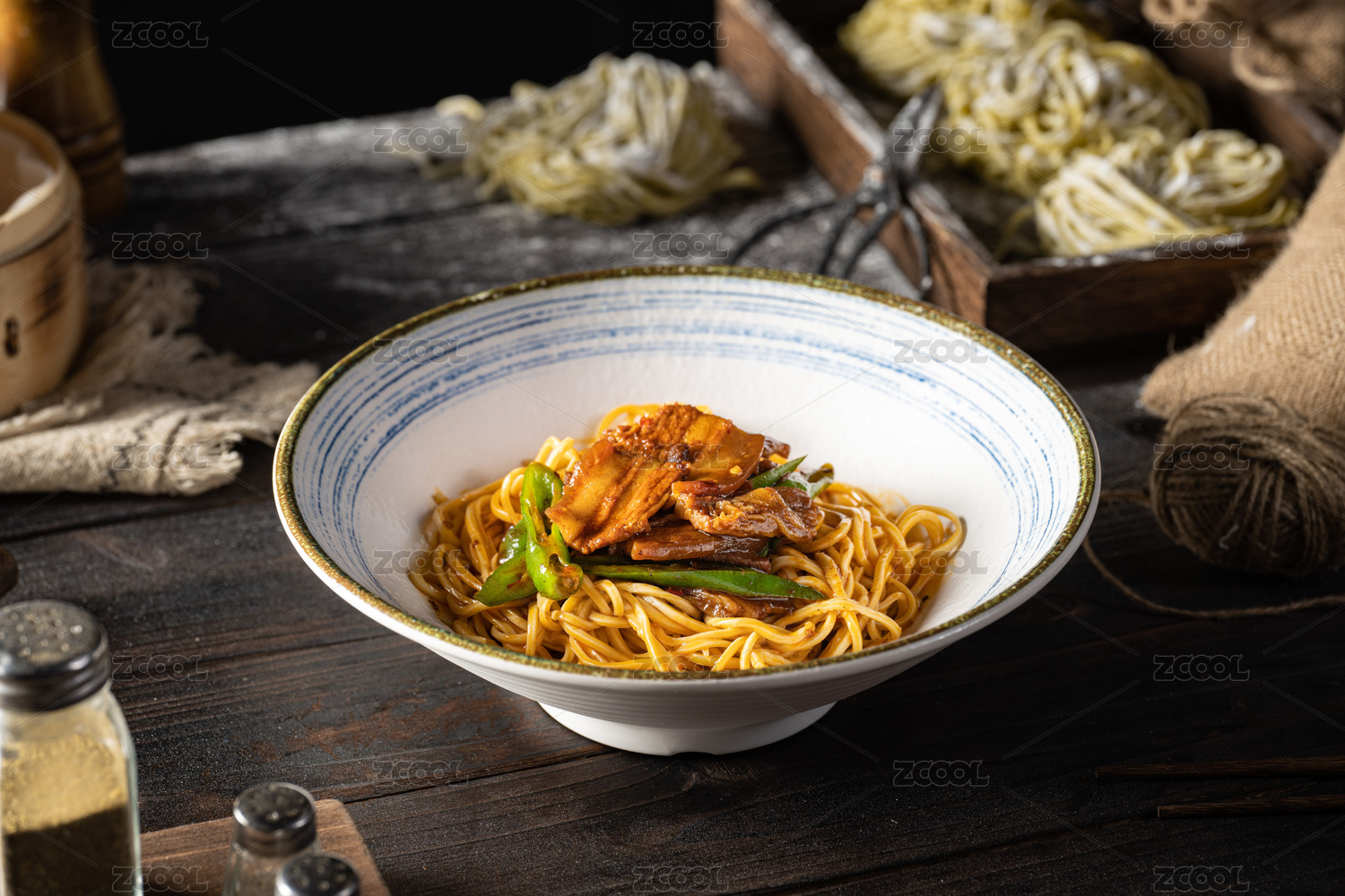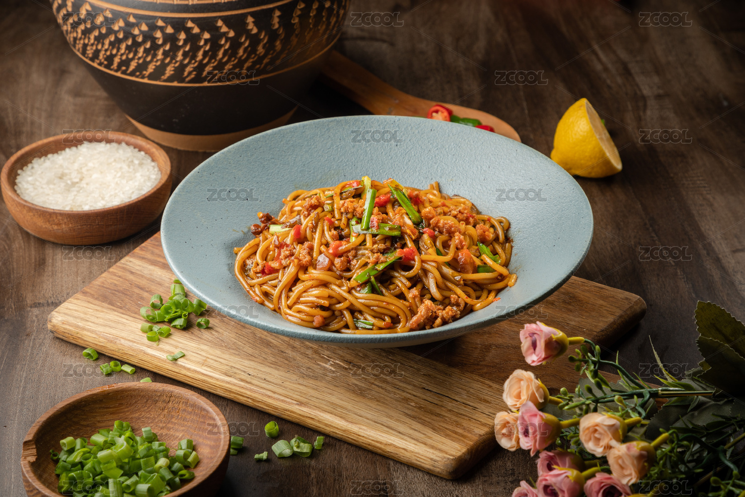 棕色桌面上放着一碗肉末炒米线