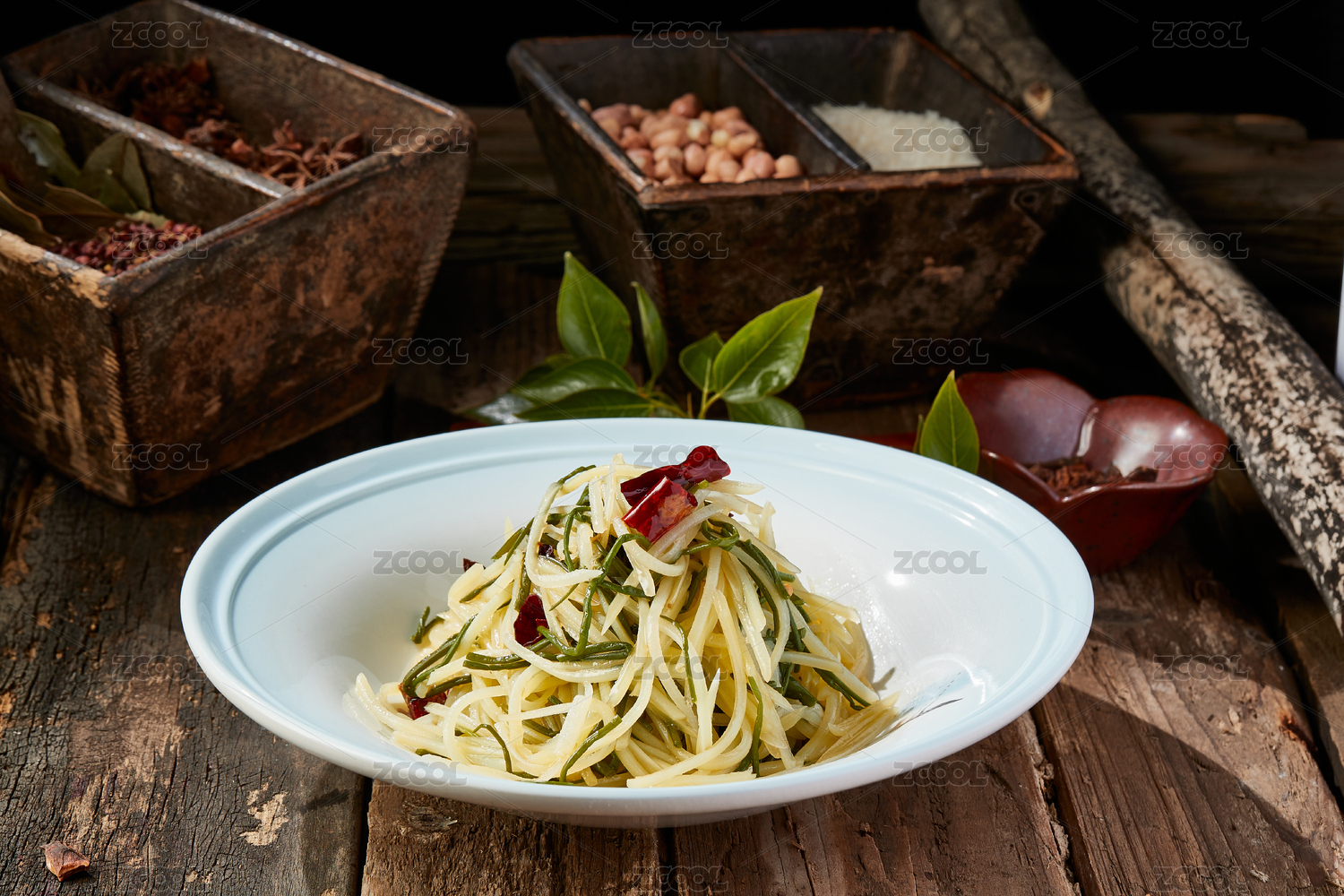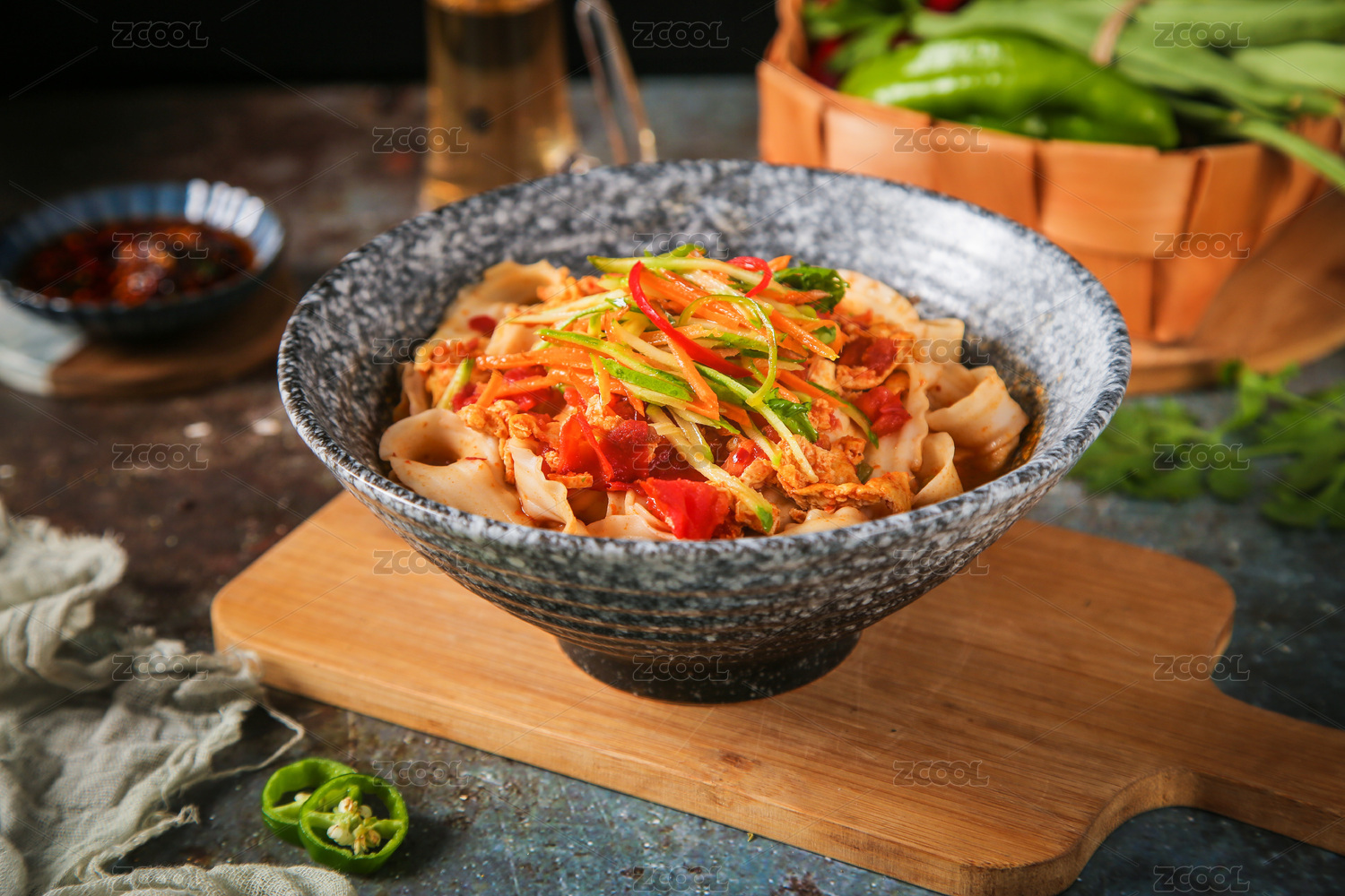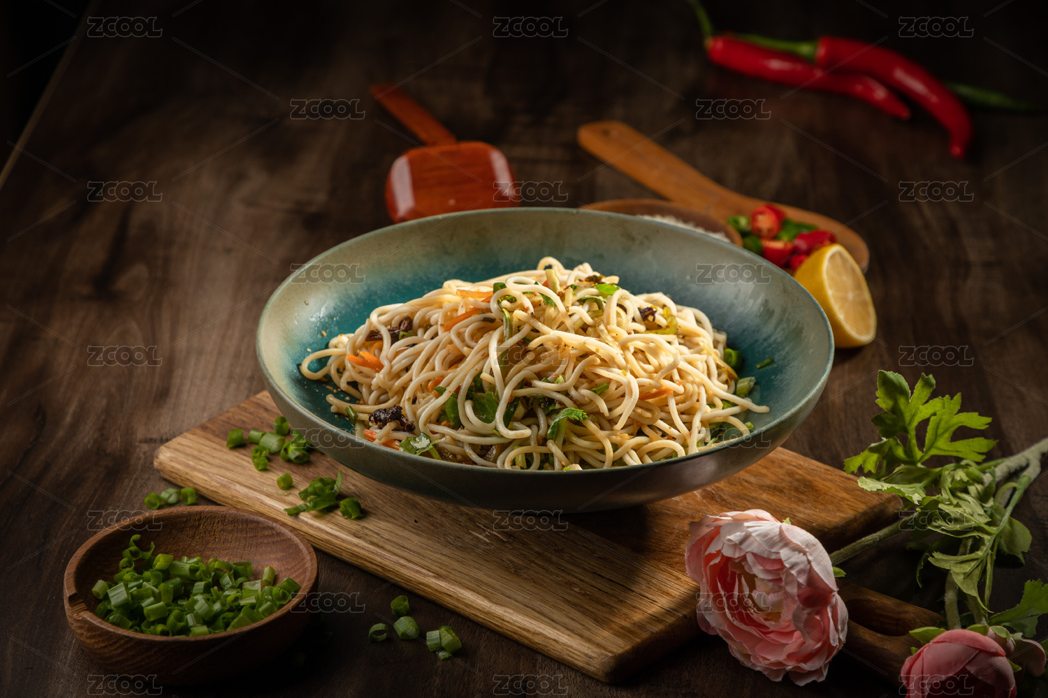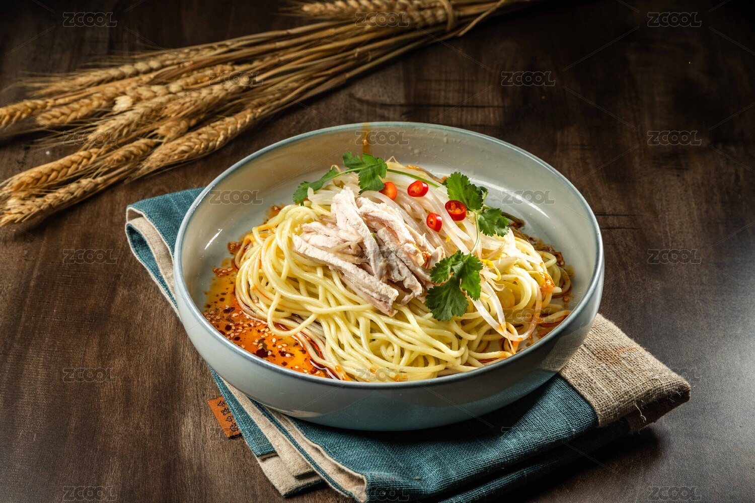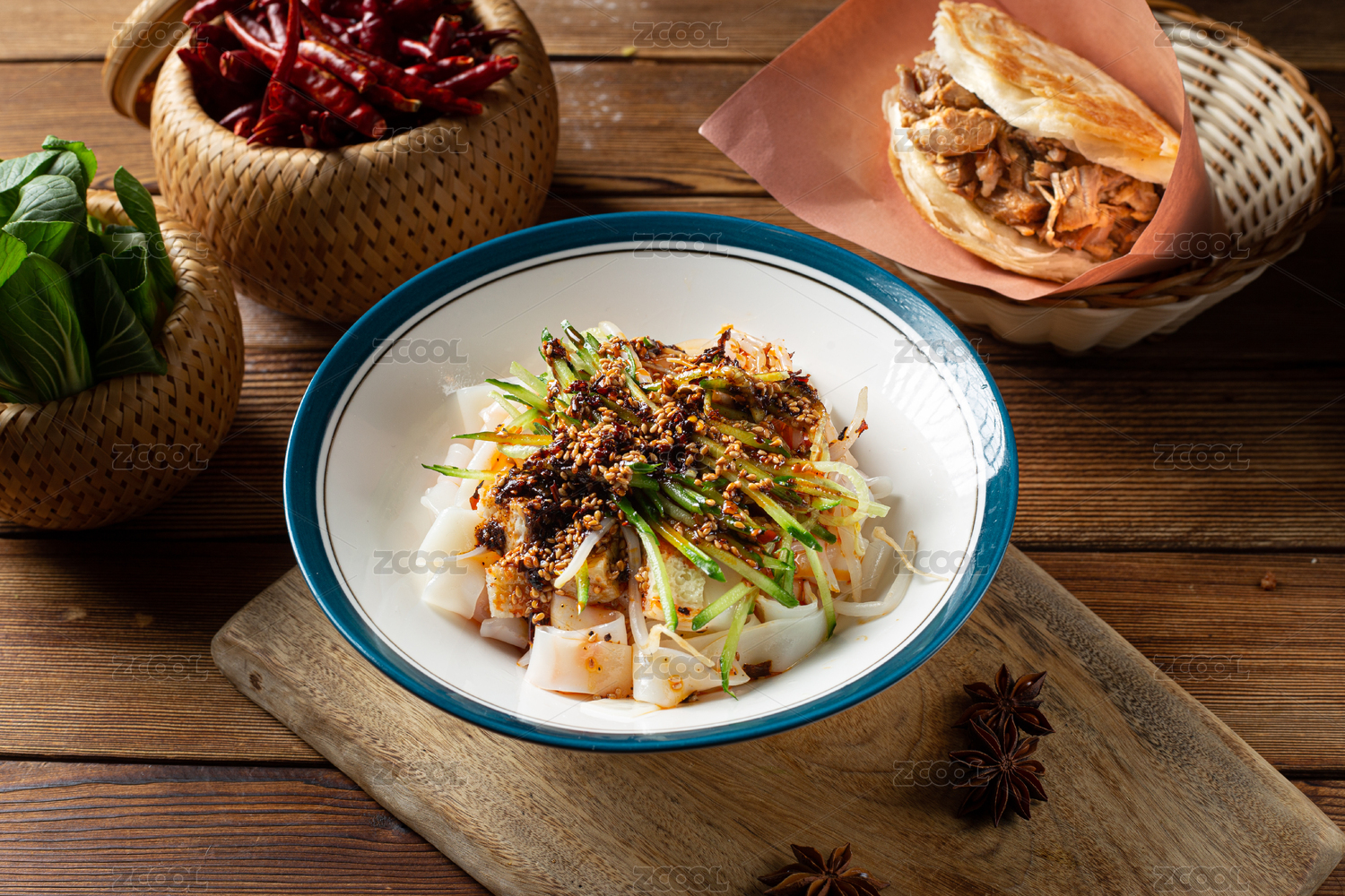 棕色木纹桌上放着一盘鸡丝凉面