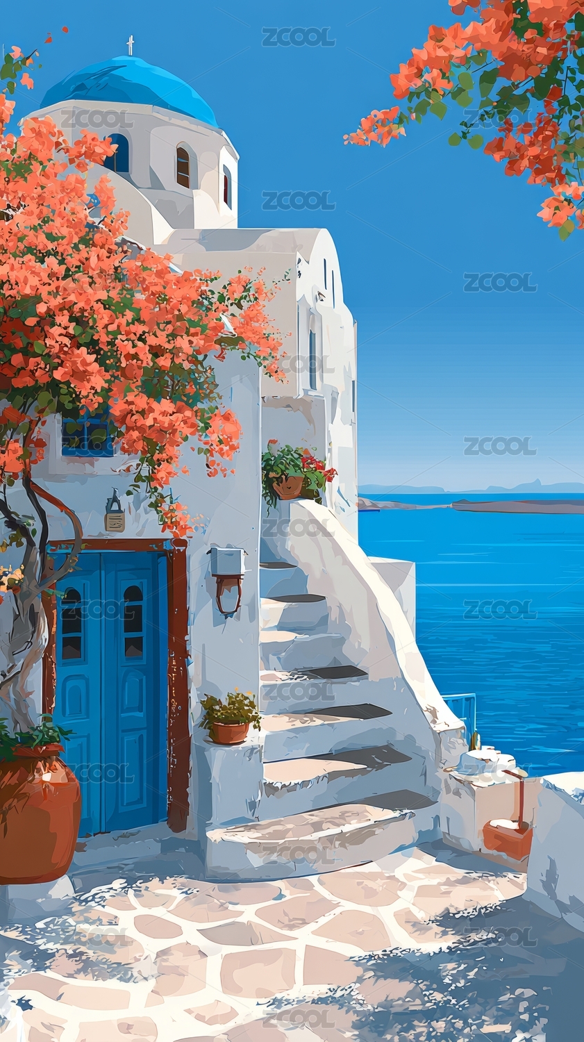 希腊圣托里尼海岛白色建筑和悬崖小镇风景