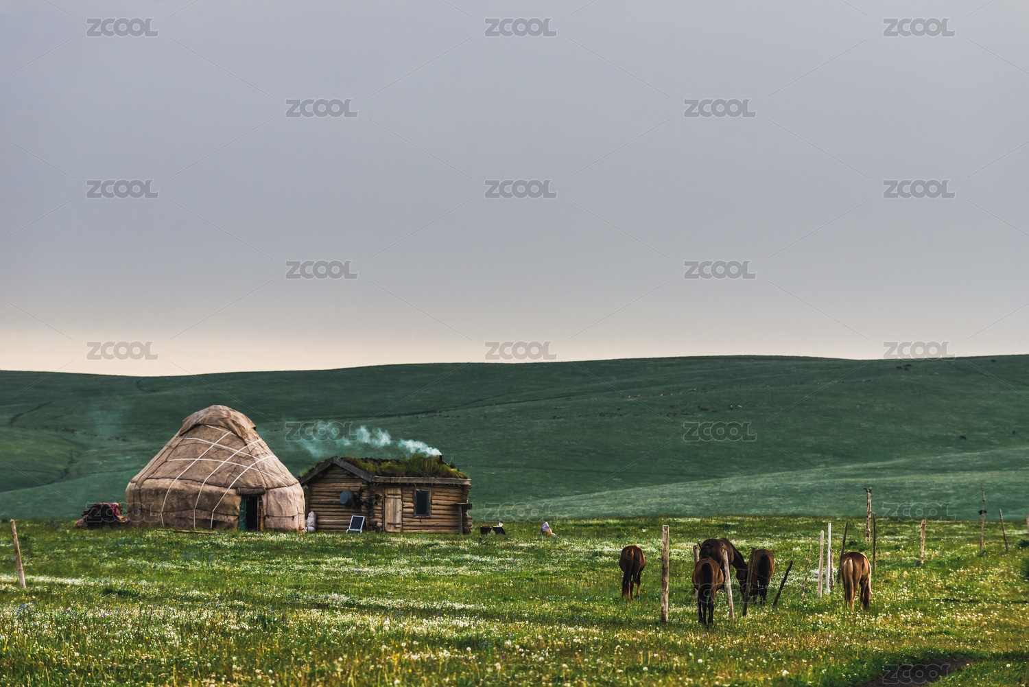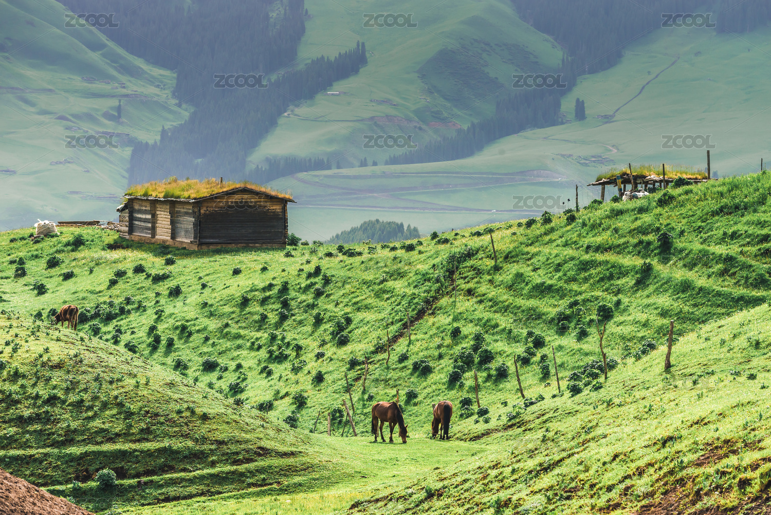 新疆伊犁琼库什台村草原木屋牛马自然风光