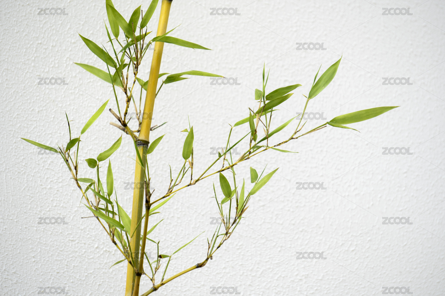 白色墙面上垂下来的绿色竹叶