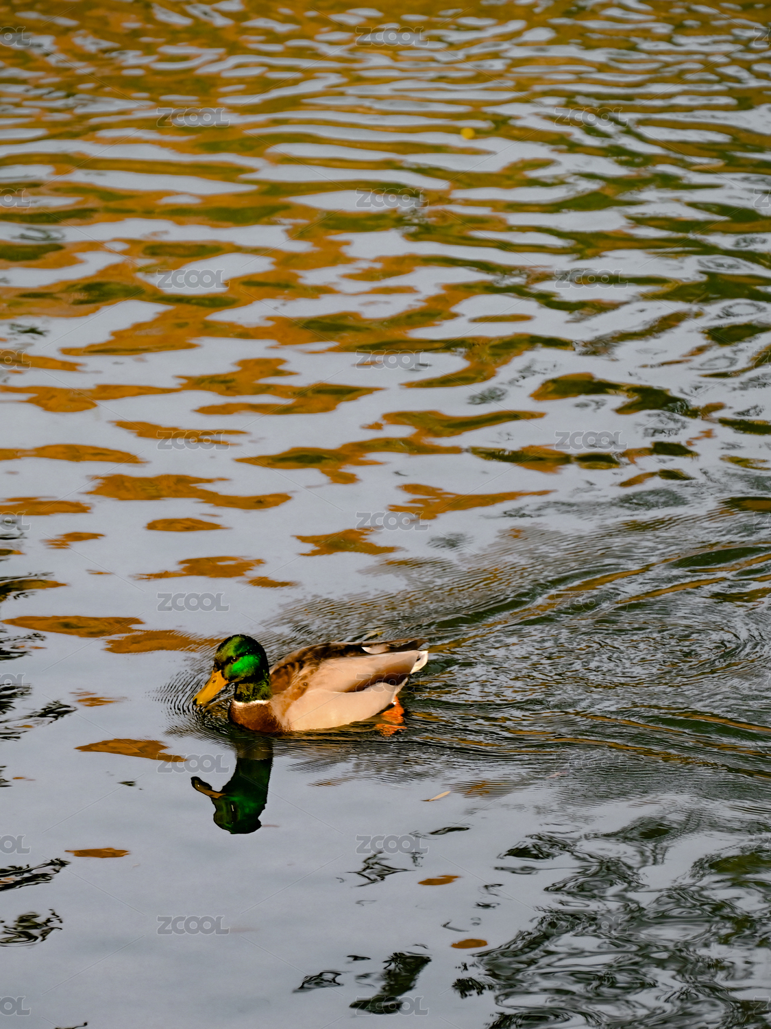 深秋阳光下在湖中惬意畅游的绿头鸭带起水波