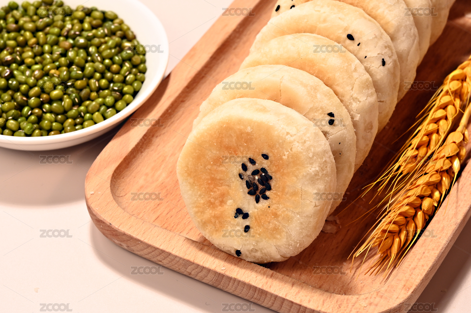 放在竹帘上的中国传统糕点绿豆饼与食材绿豆面粉麦穗