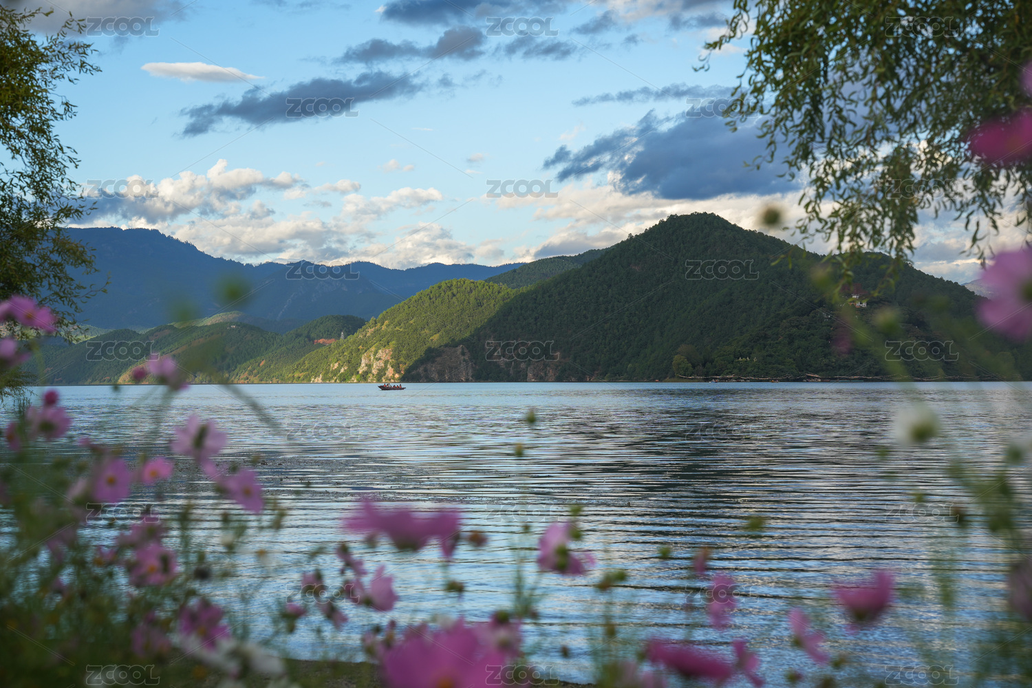 云南丽江泸沽湖,鲜花盛开的湖岸