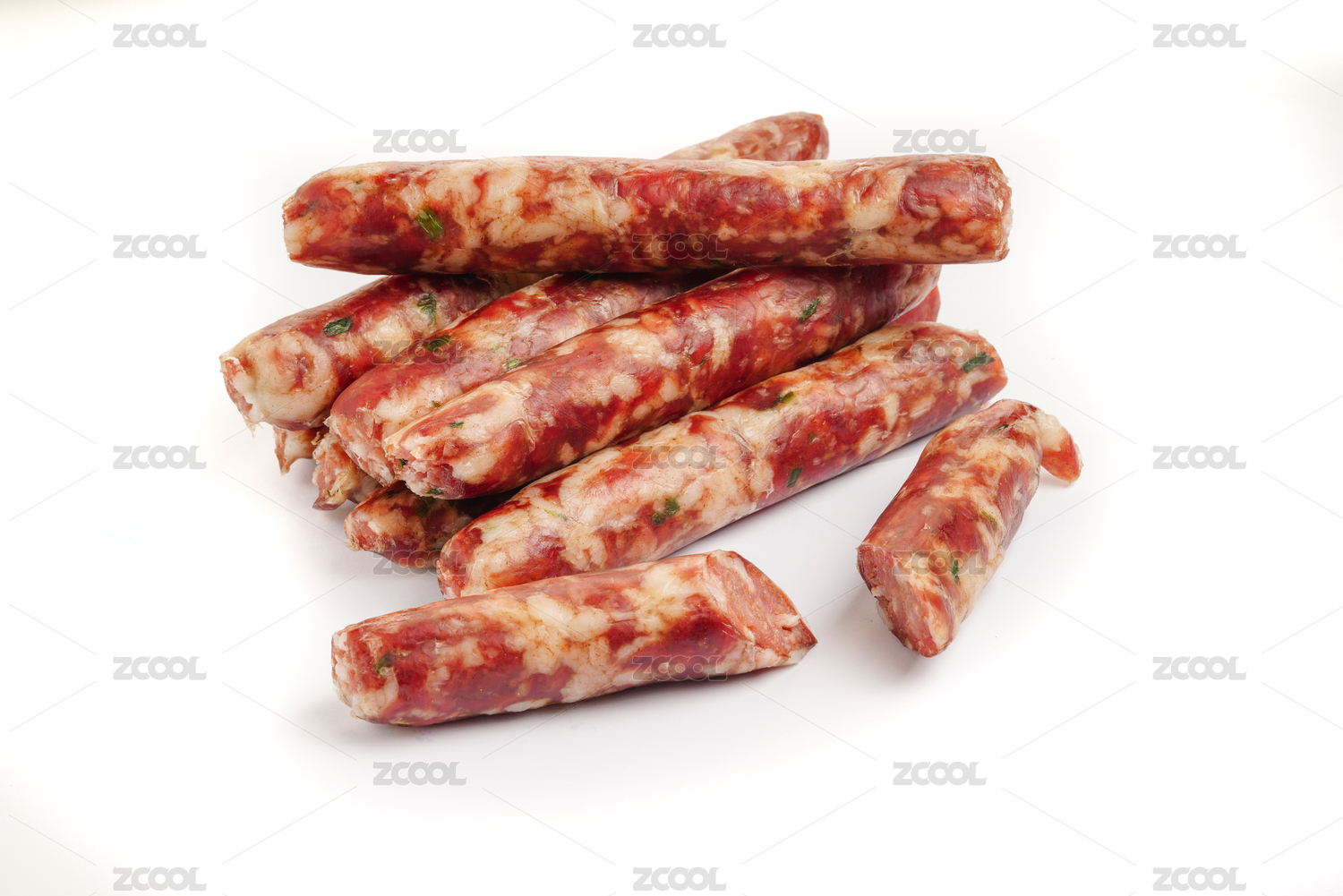 白色背景上一堆切开的猪肉灌香肠
