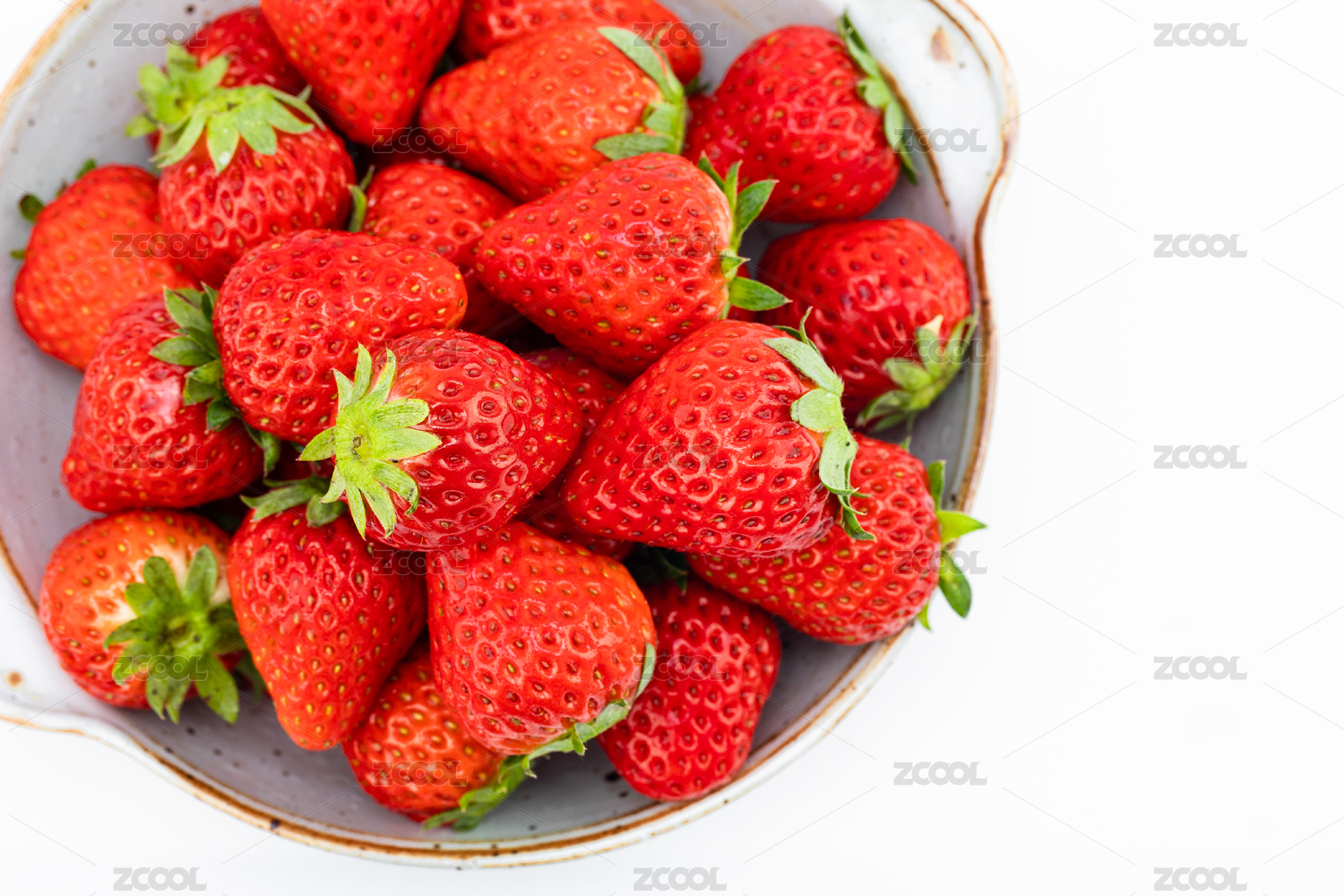 红色陶瓷碗里的新鲜草莓和白色背景