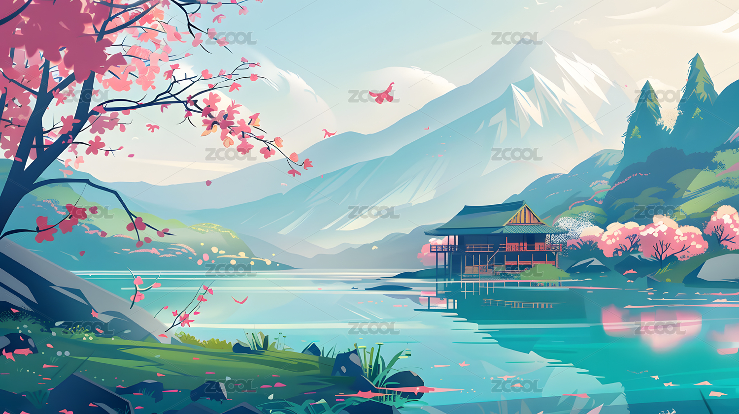 桃花,山,风景,户外,插画,自然,高山,云,地形,自然美