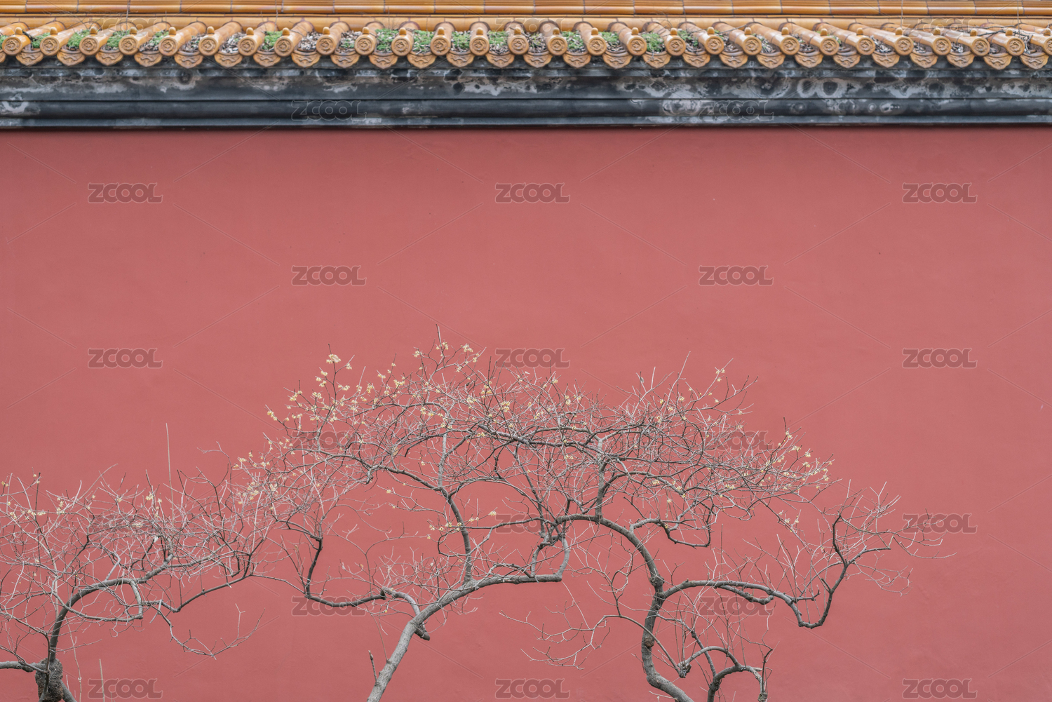 盛开的腊梅与红色古代围墙背景
