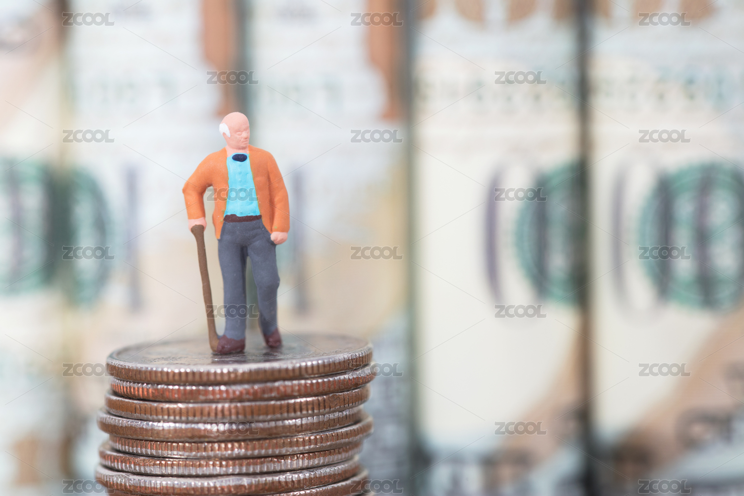 孤独的老人微缩模型站在硬币上