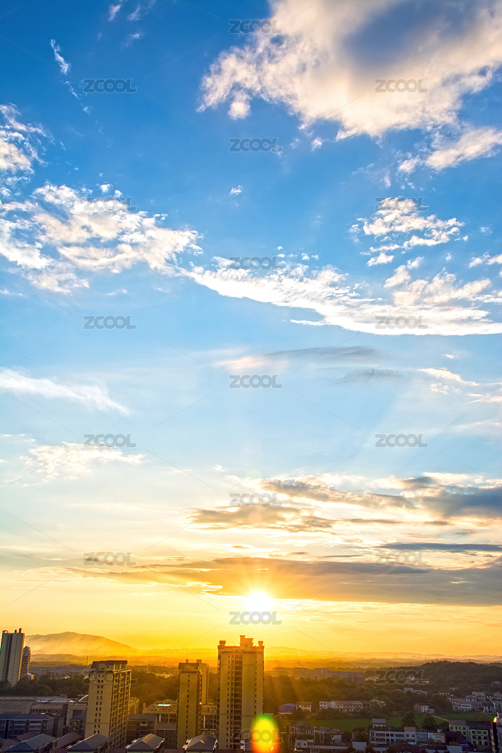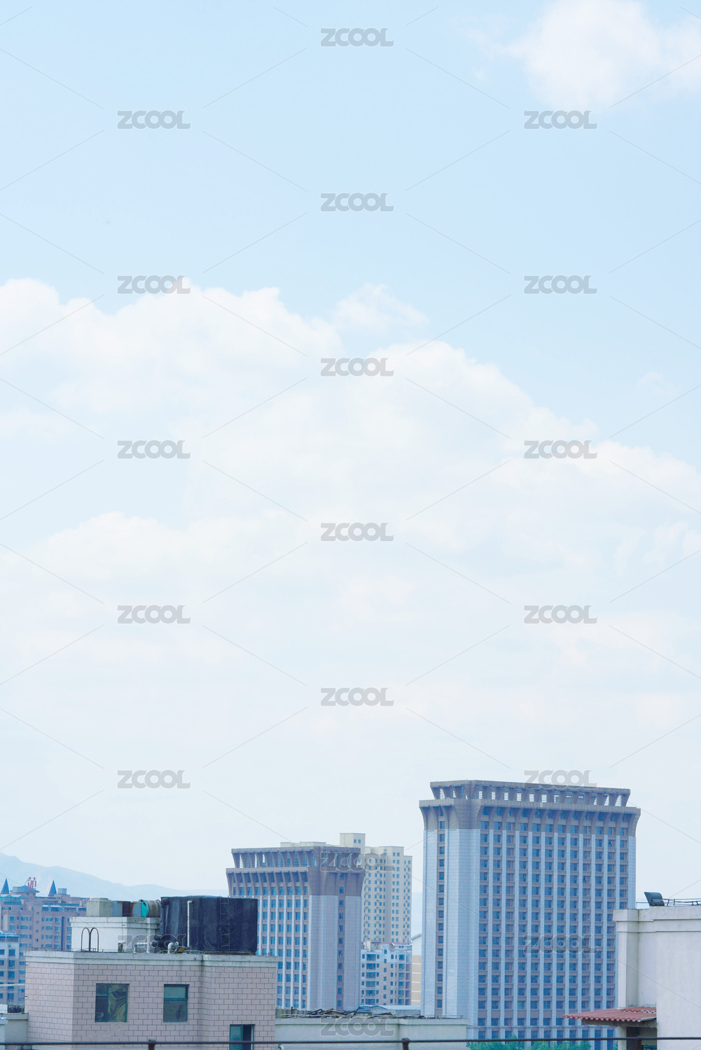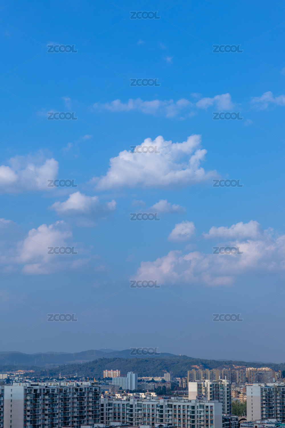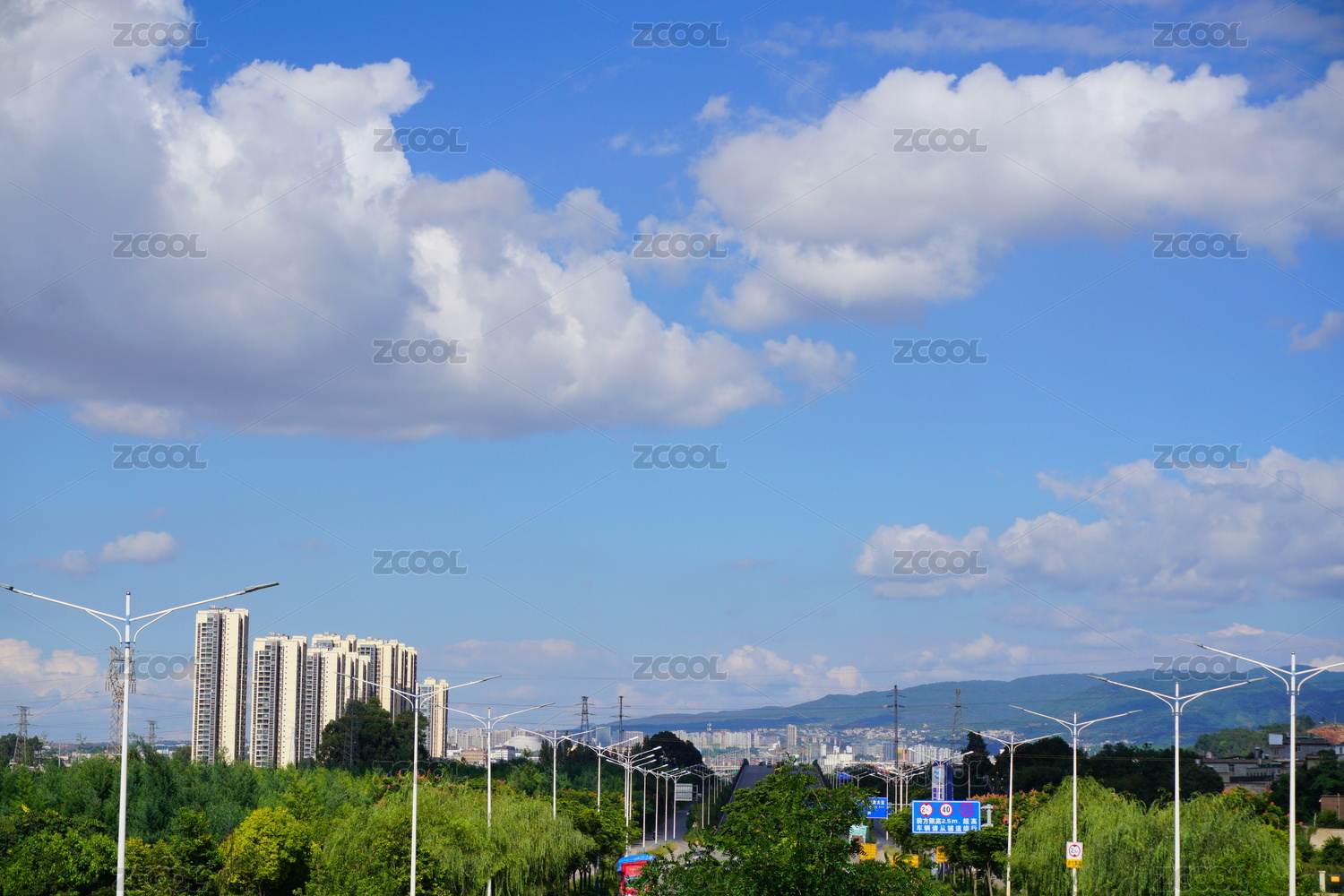 蓝天白云映衬下的住宅楼群及路边的树木美景,中国北京昌平