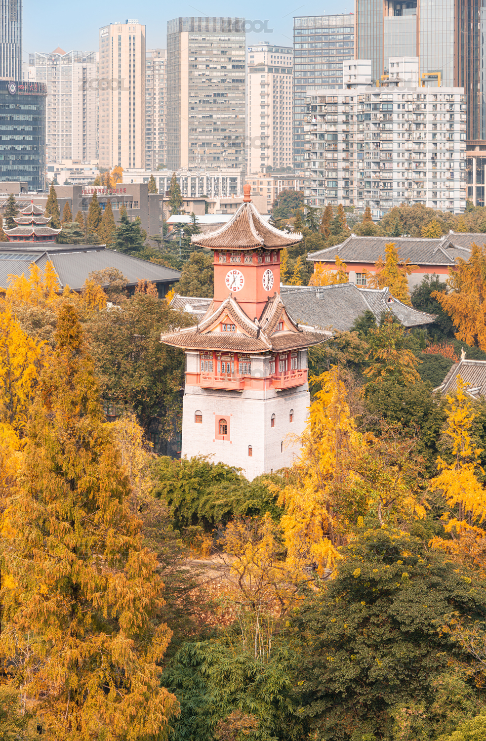 中国成都四川大学华西校区钟楼银杏树秋季风