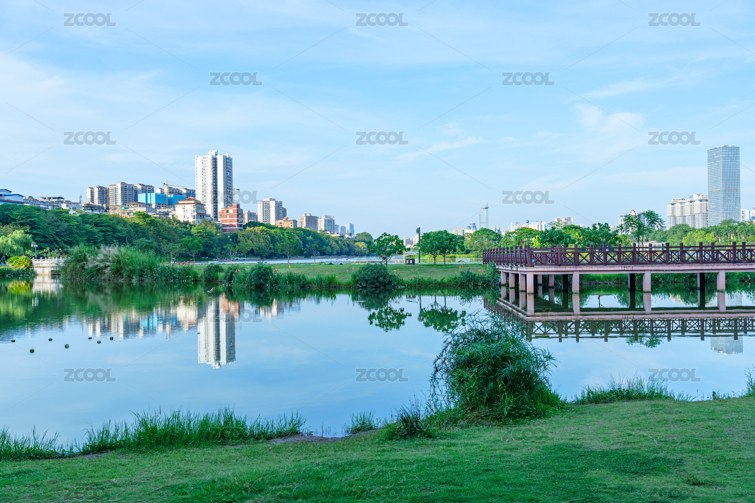 南宁南湖公园湖泊栈道绿色草地与城市景观