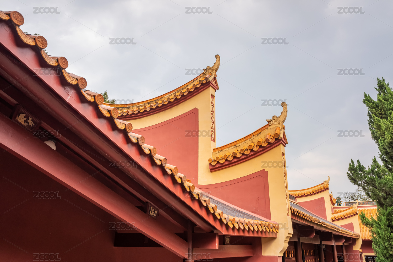 中国古寺庙建筑屋角飞檐琉璃瓦特写