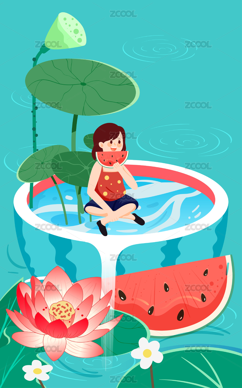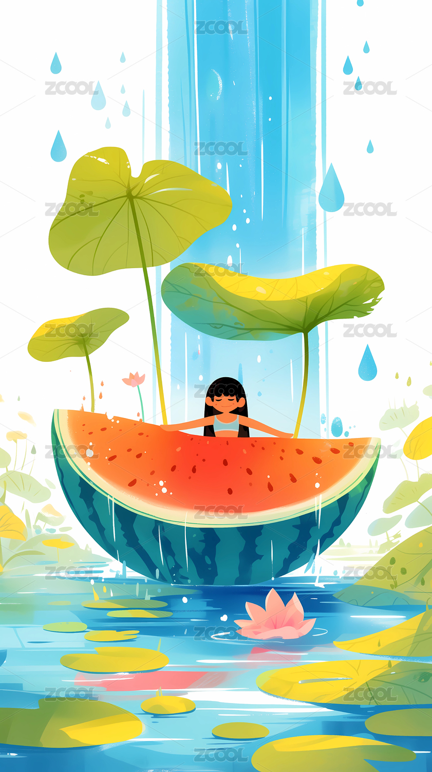 立夏节气人物解暑降温插画夏天西瓜荷花海报