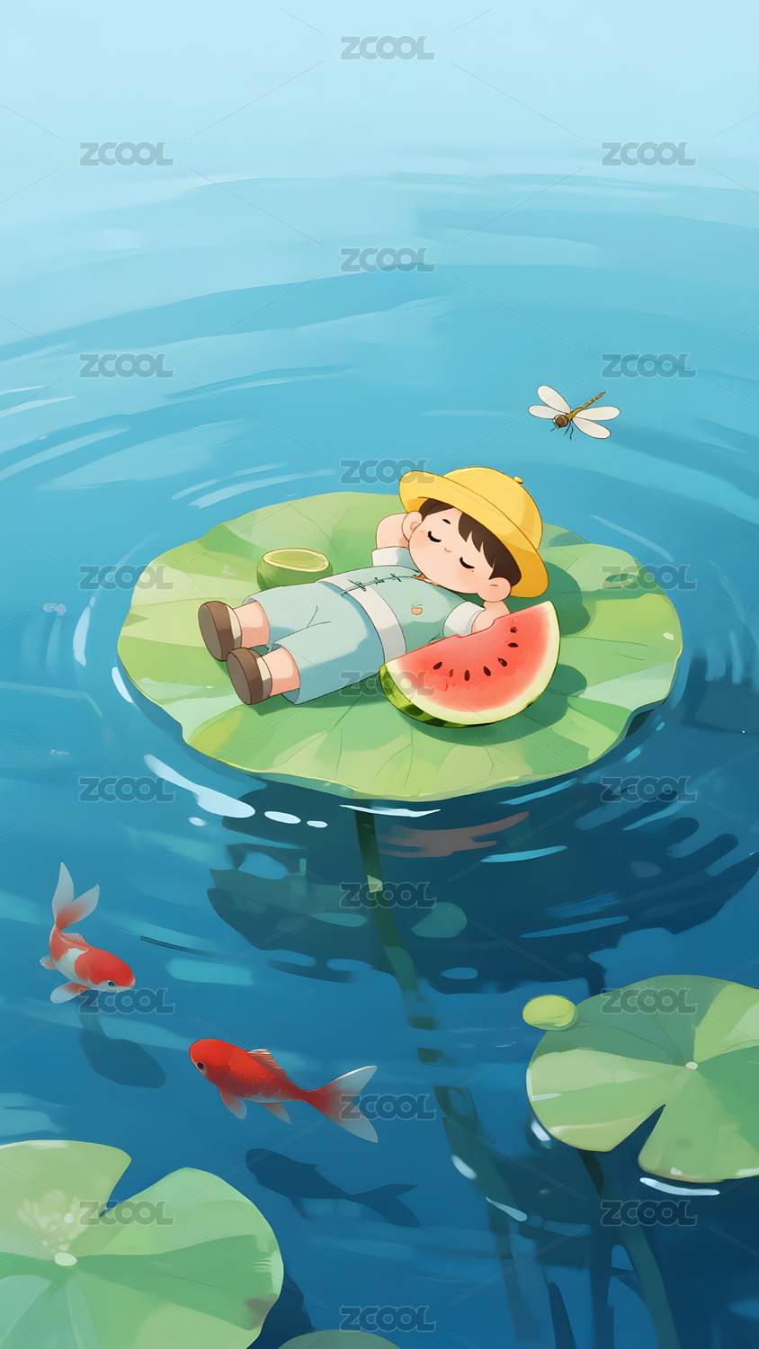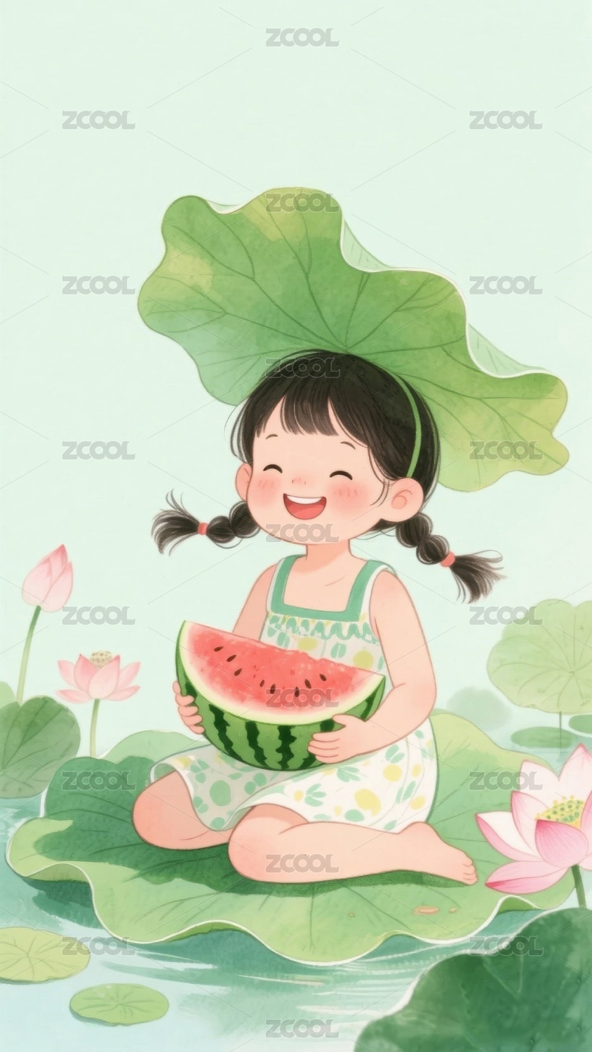 荷叶上的小女孩手捧西瓜