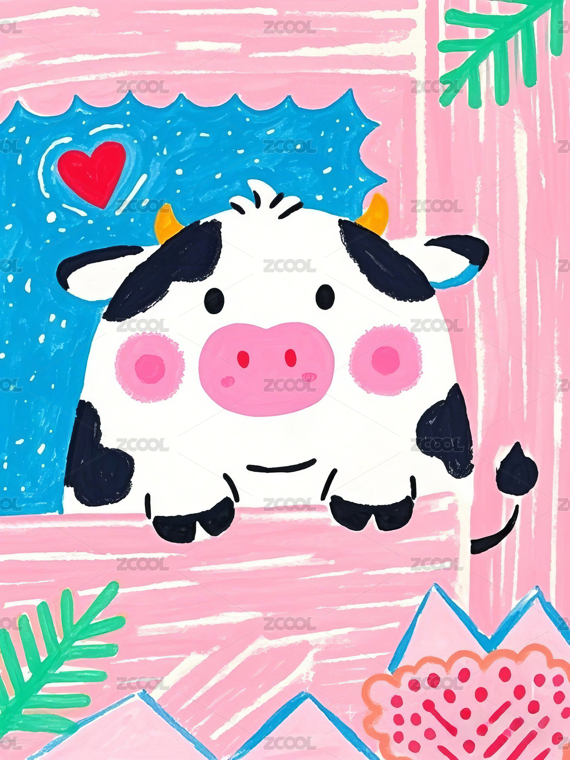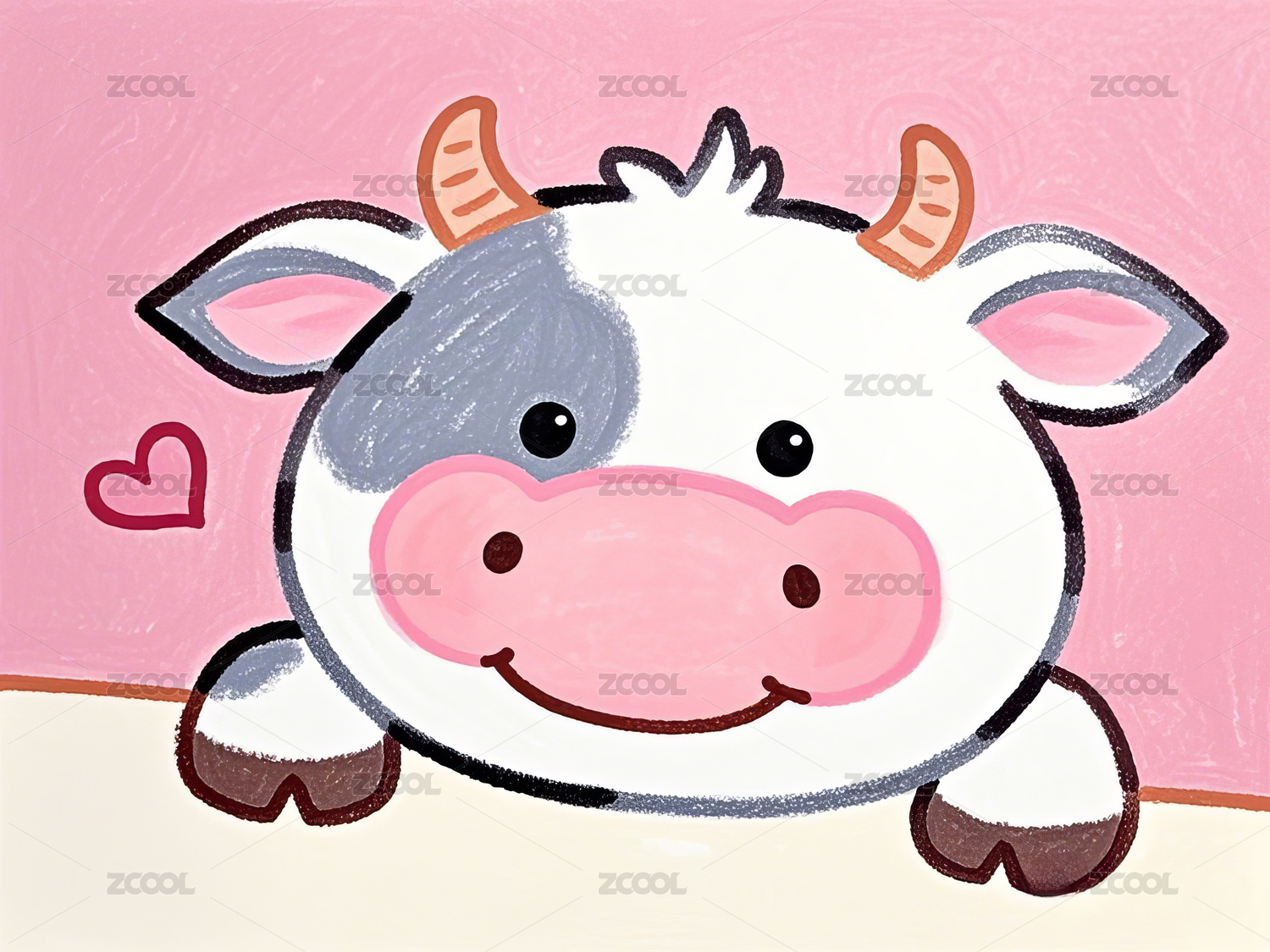 粉色,彩色,蜡笔,简笔画,生肖,可爱,卡通,牛年,牛,小牛