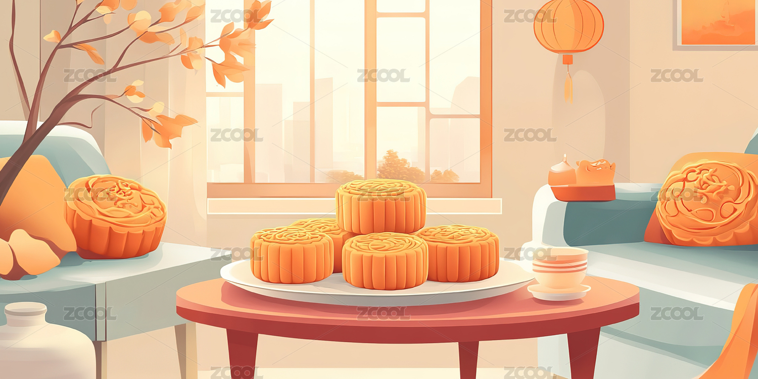 中秋节海报卡通插画桌上放着月饼茶具柿子