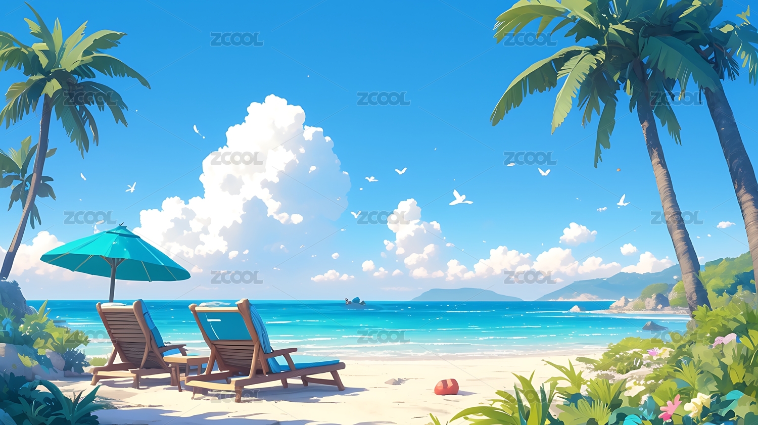 卡通插画大海沙滩风景