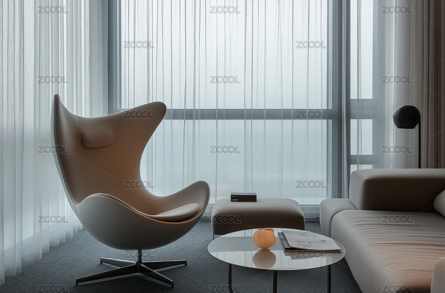 现代简约客厅的蛋形椅与圆形茶几