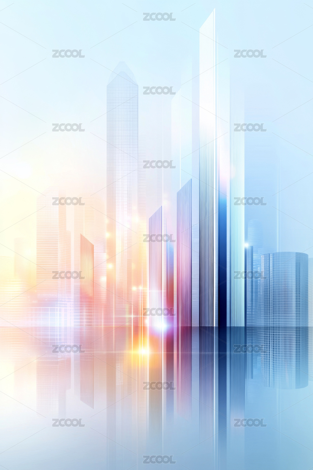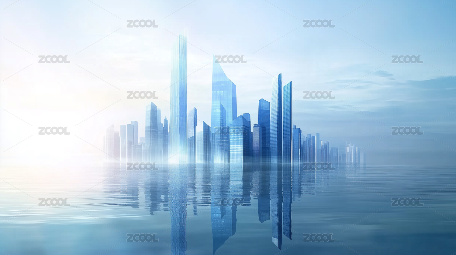 科技城市虚拟概念玻璃建筑水面倒影背景