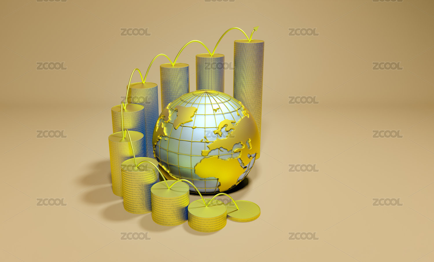 地球与金币堆砌财经理财投资股票股市走势趋势上涨的增长的高速发展概念