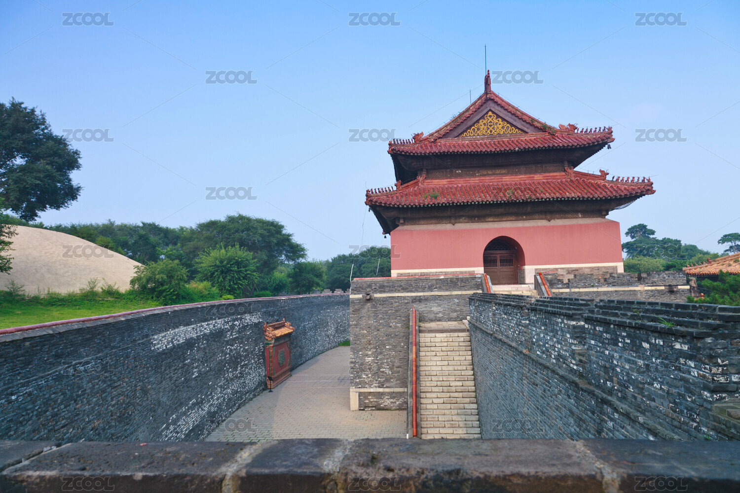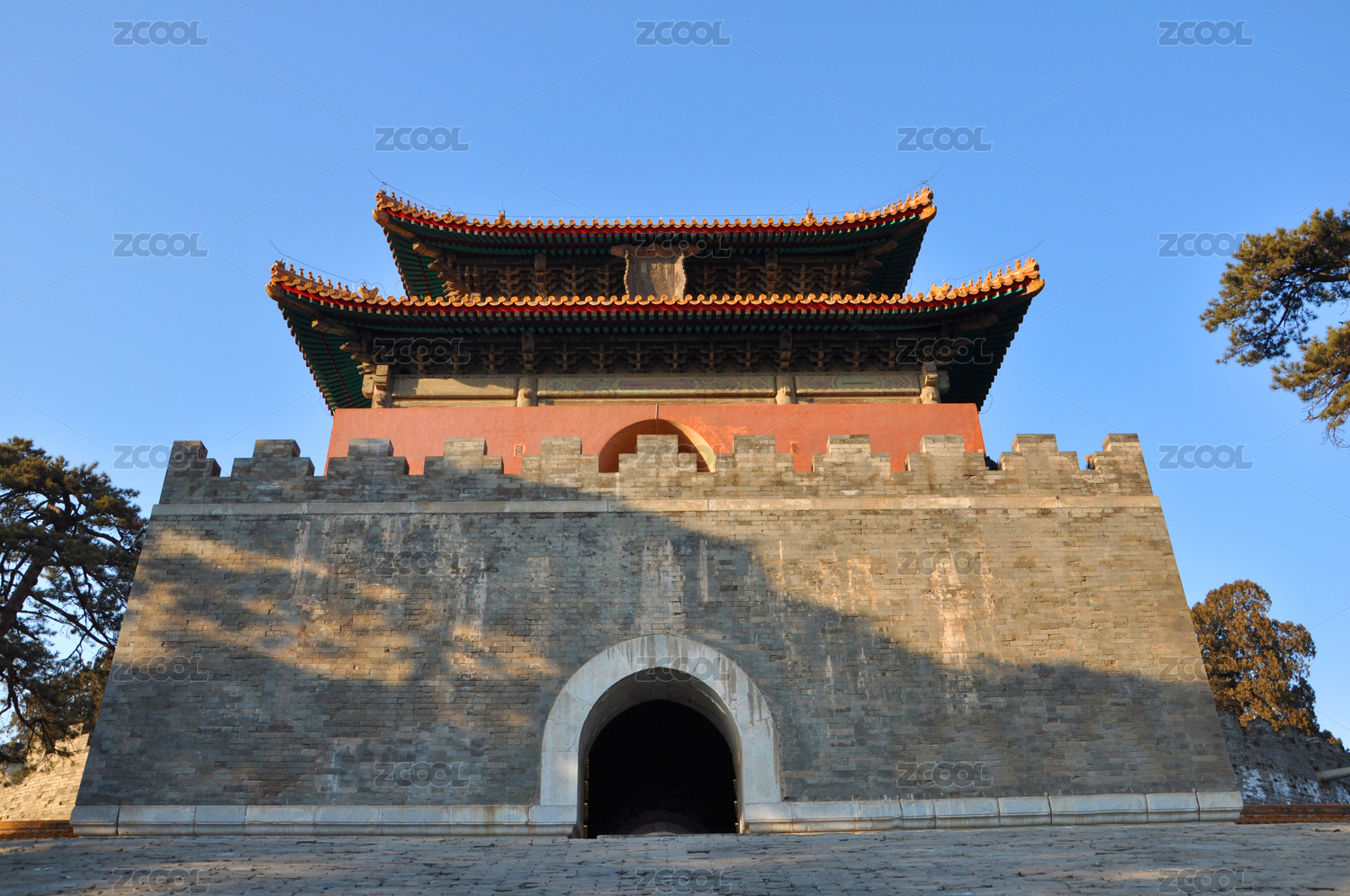 中国南京钟山风景区明孝陵古建筑城楼和树