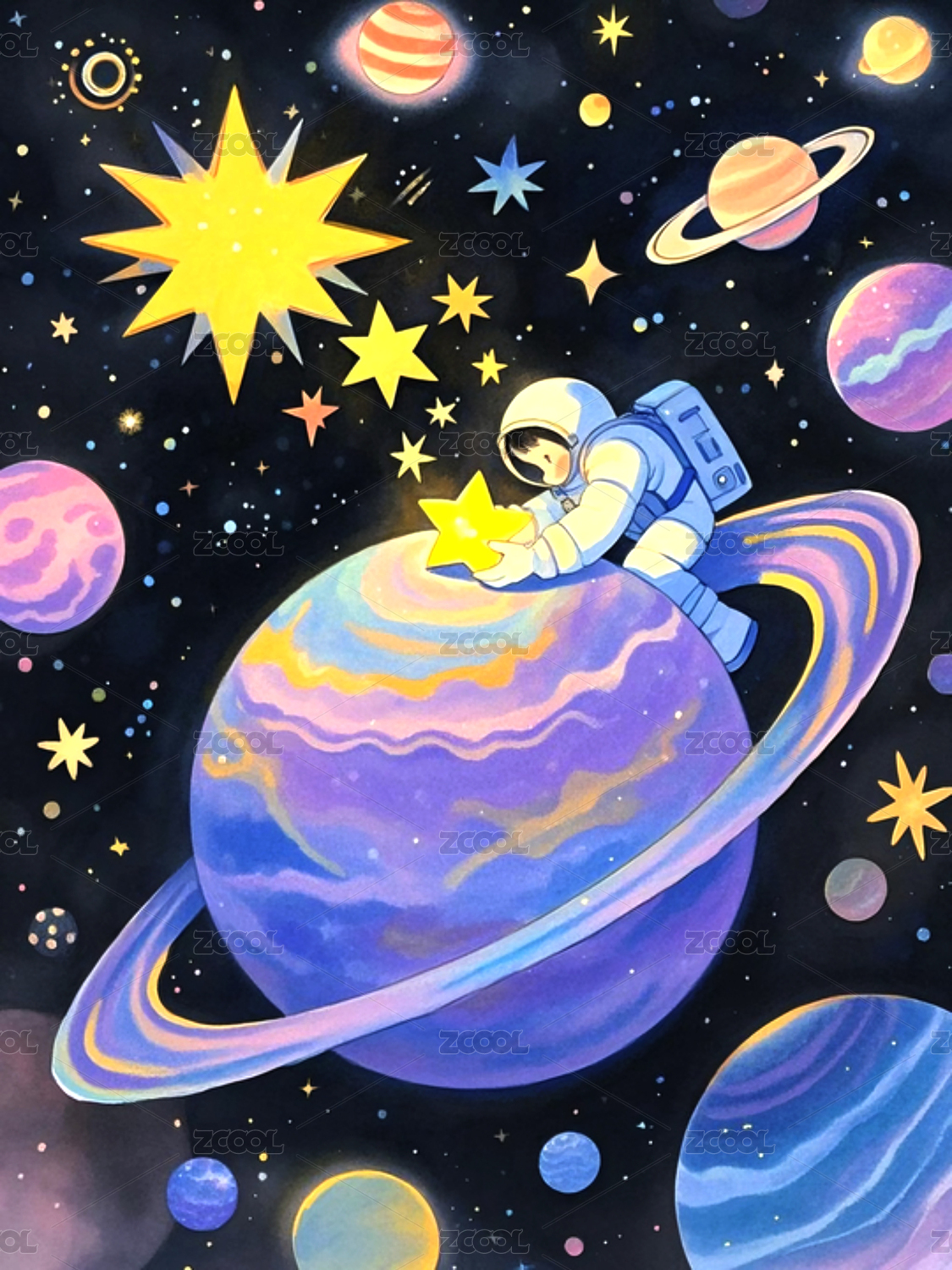 插画星球宇宙宇航员抱星星手绘梦幻场景