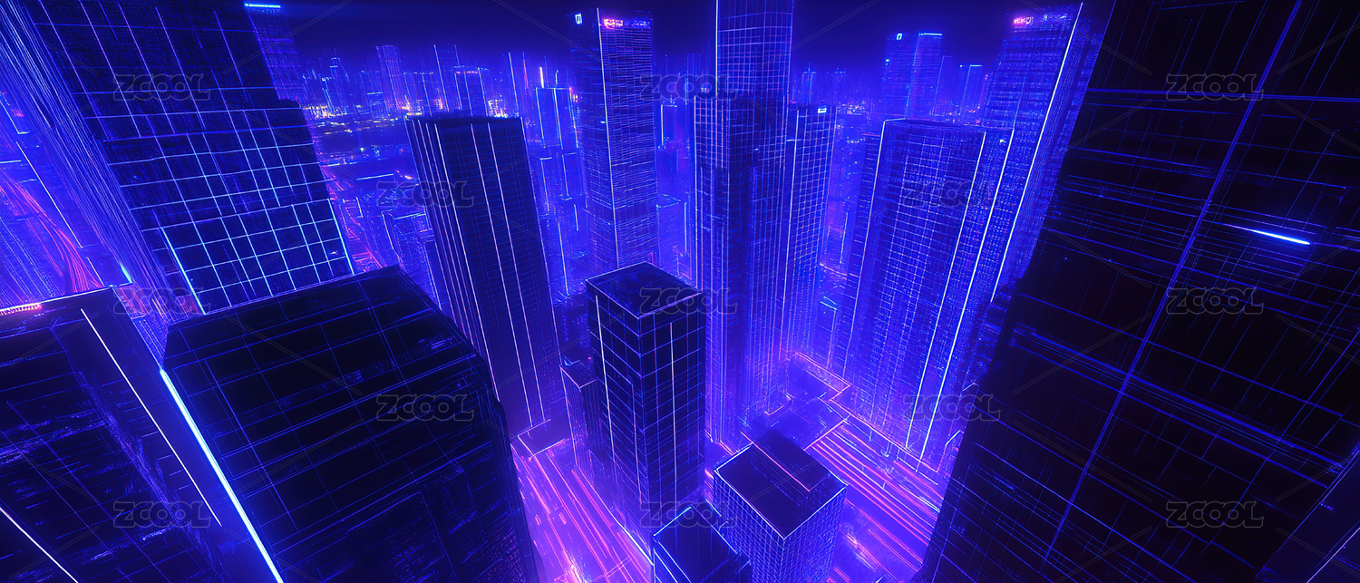 赛博朋克,霓虹,灯光,蓝色,紫色,金融区,都市风景,城市,摩天大楼,天际线