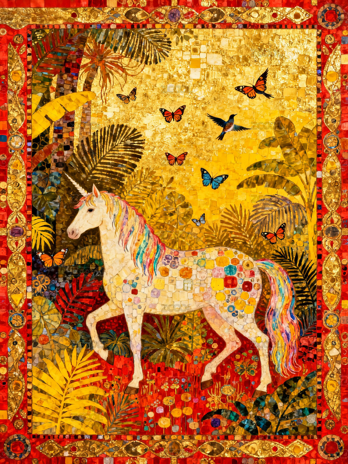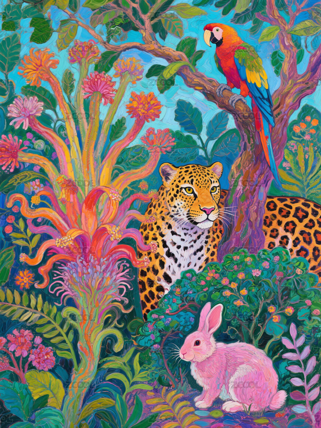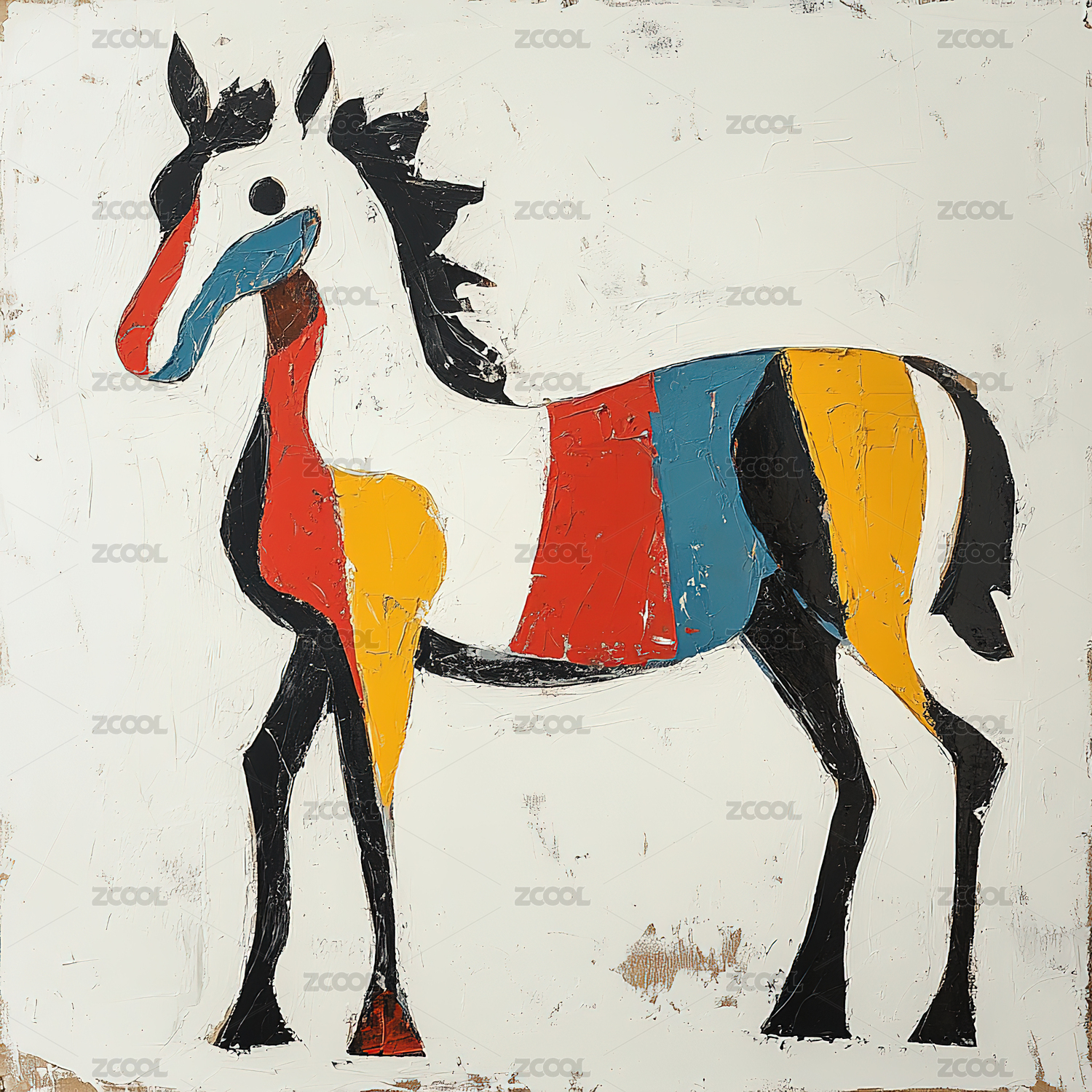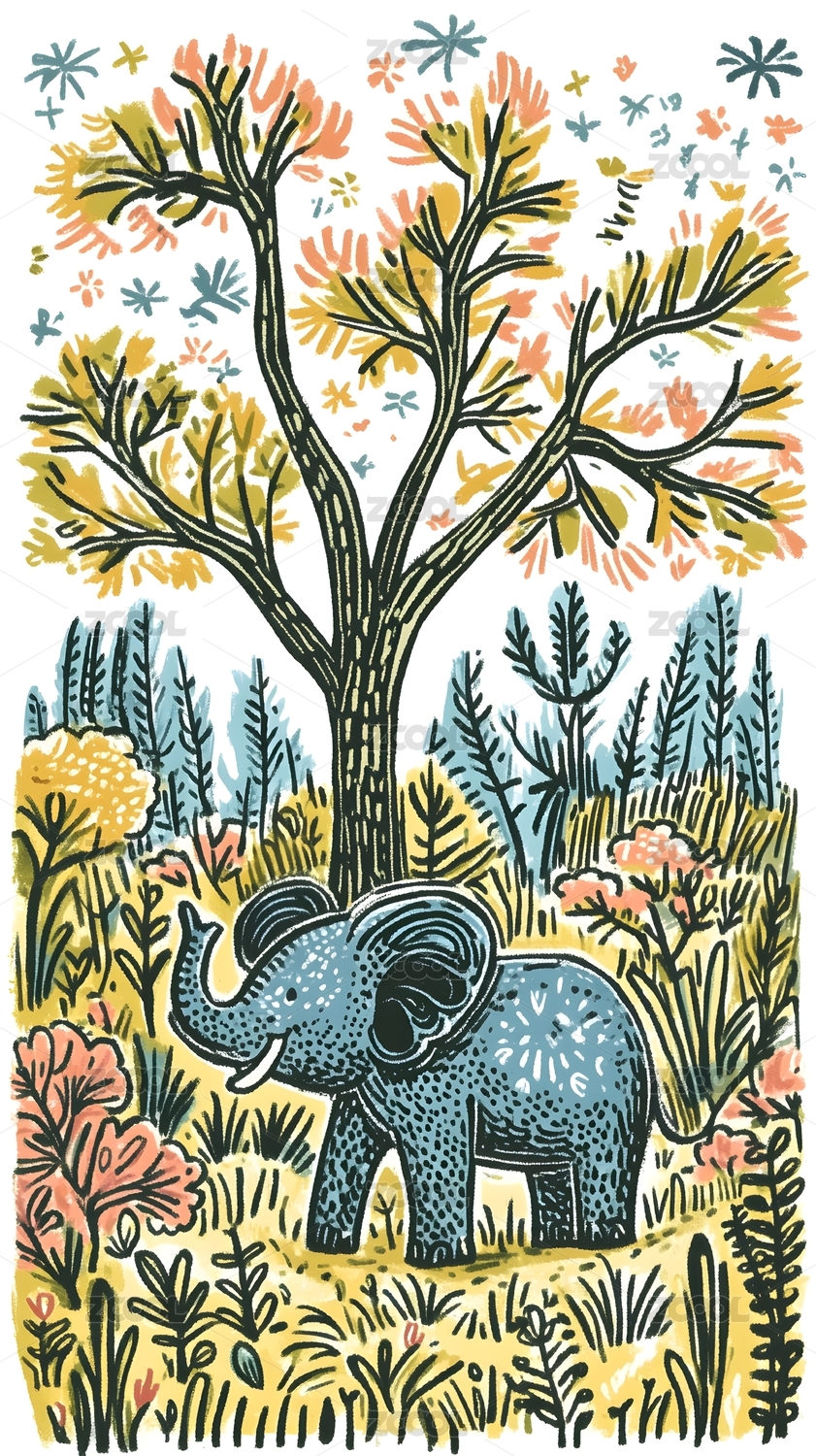 动物以松散的笔触渲染,增添了运动感和活力 , 而树木则更加扎实 , 密集的线条工作 , 绘画富有夸张 , 象征性细节 。