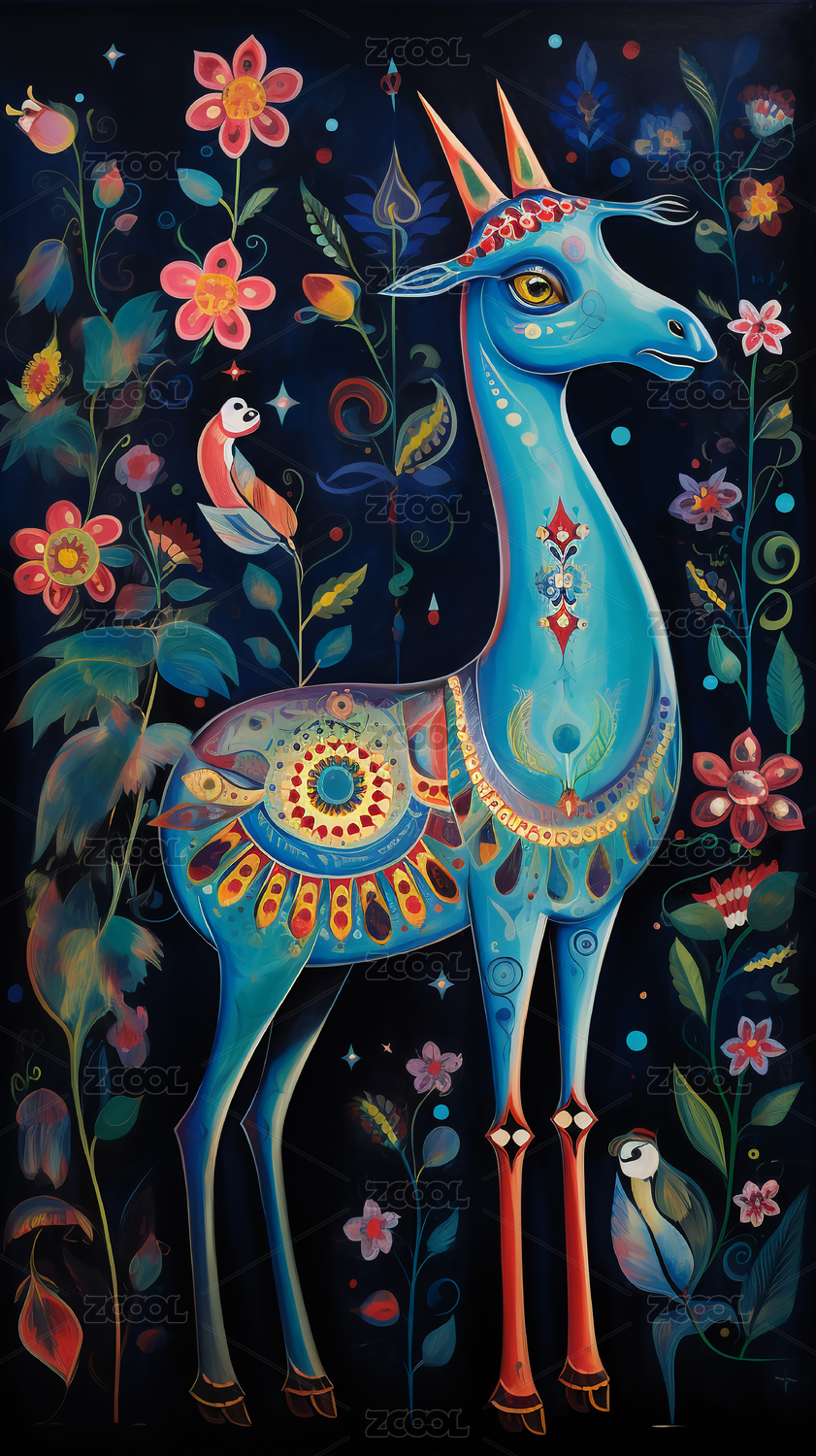 长颈鹿和羚羊 , 长颈鹿是黄色的,带有醒目的黑色和红色图案 ,树木采用黑色、红色、蓝色。