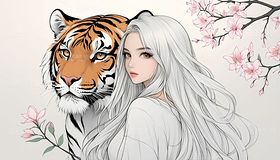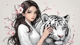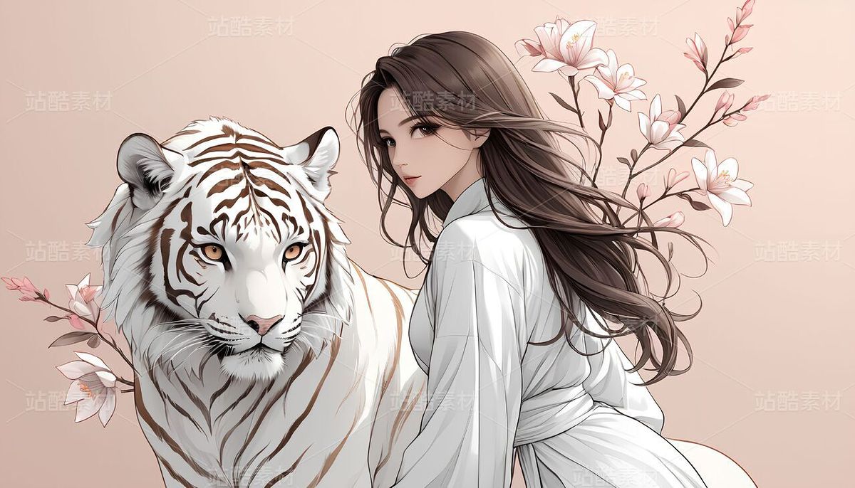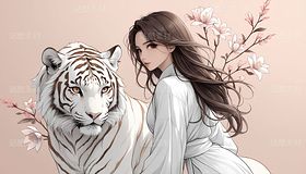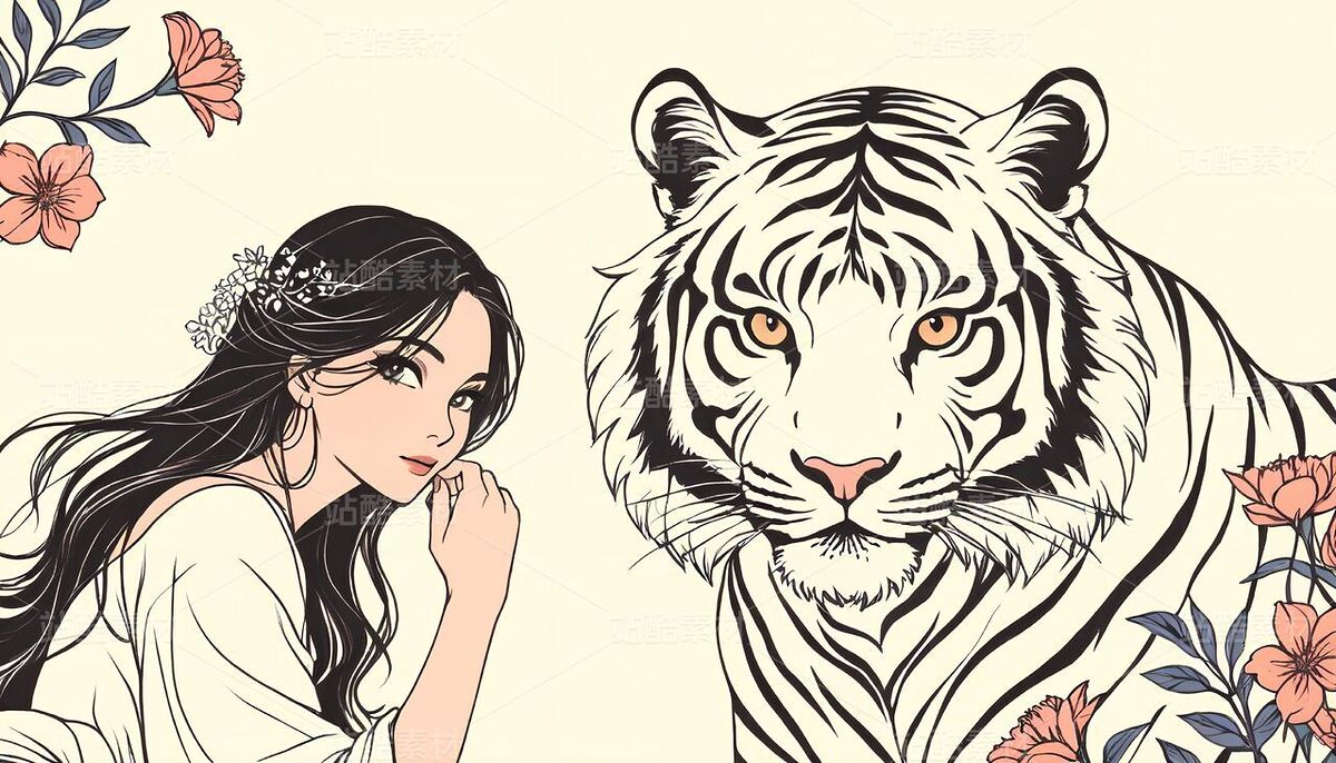 这是《美女与野兽》第二辑《少女与虎》,一共6幅作品,横幅,像素 4000 x 2682 。线描+淡彩,比较适合做电脑桌面或文创用品。