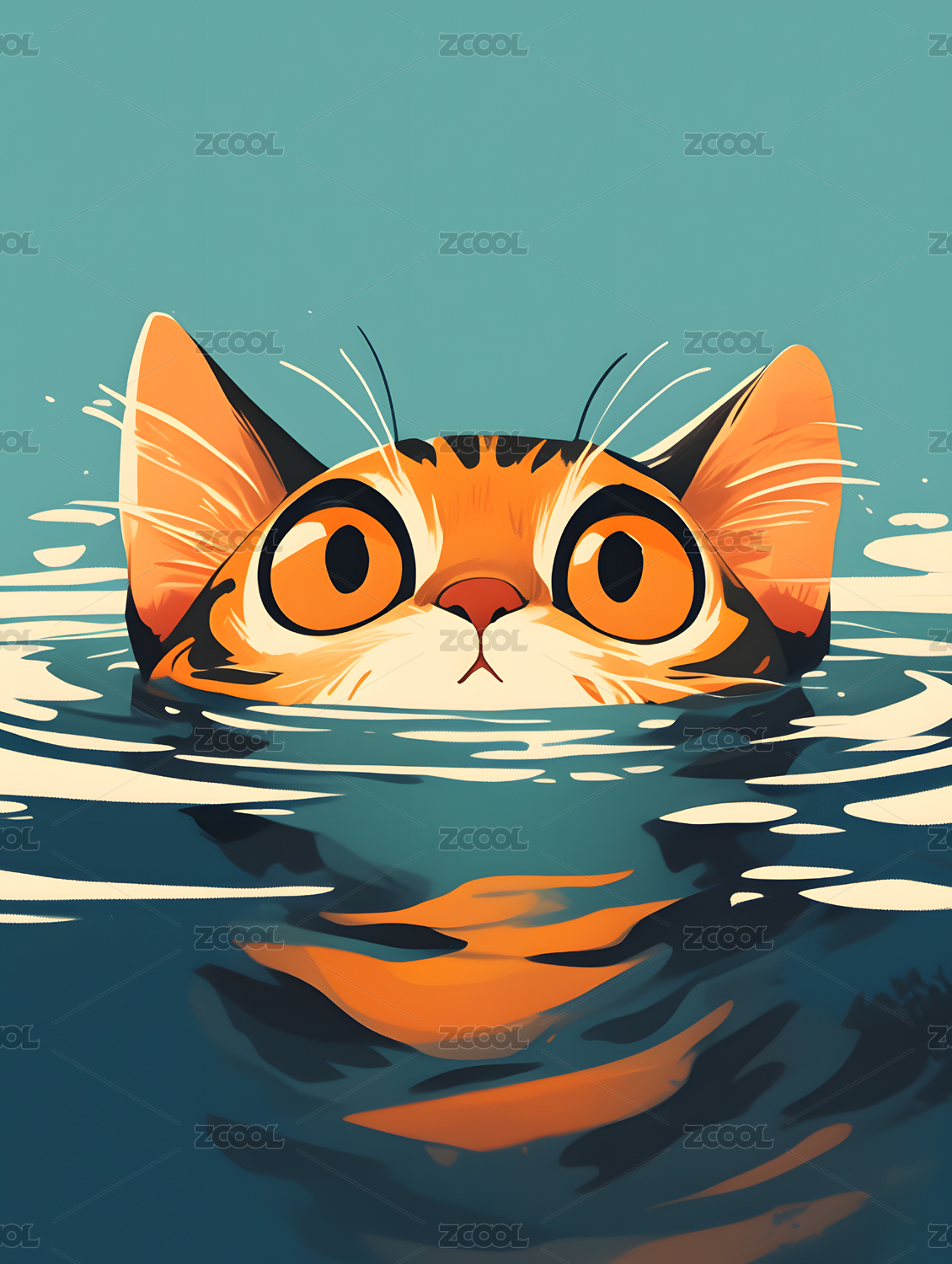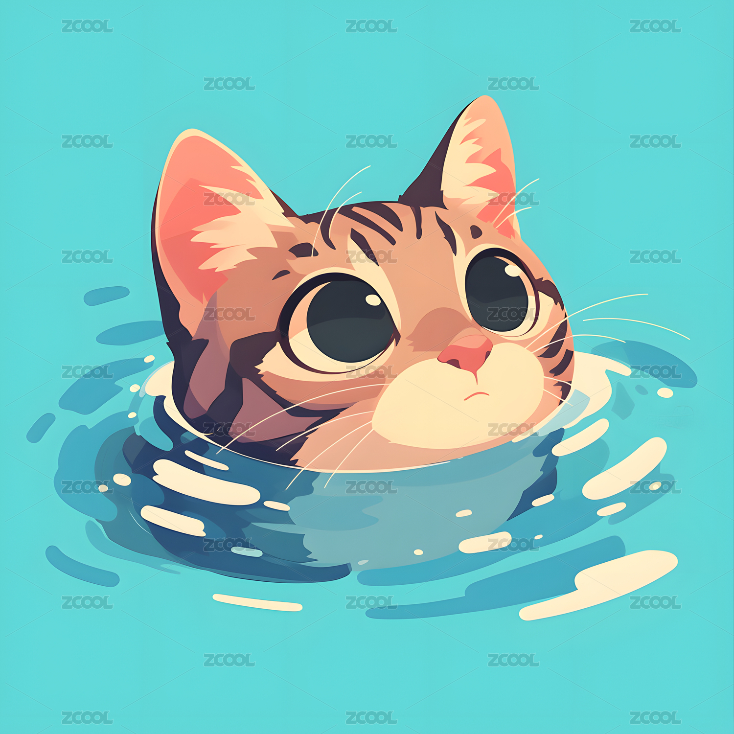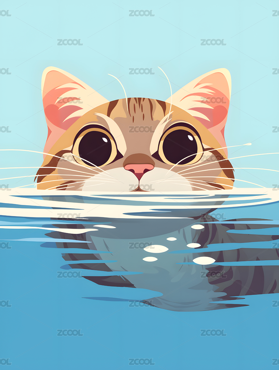 扁平儿童插画一只可爱的猫在水里游泳