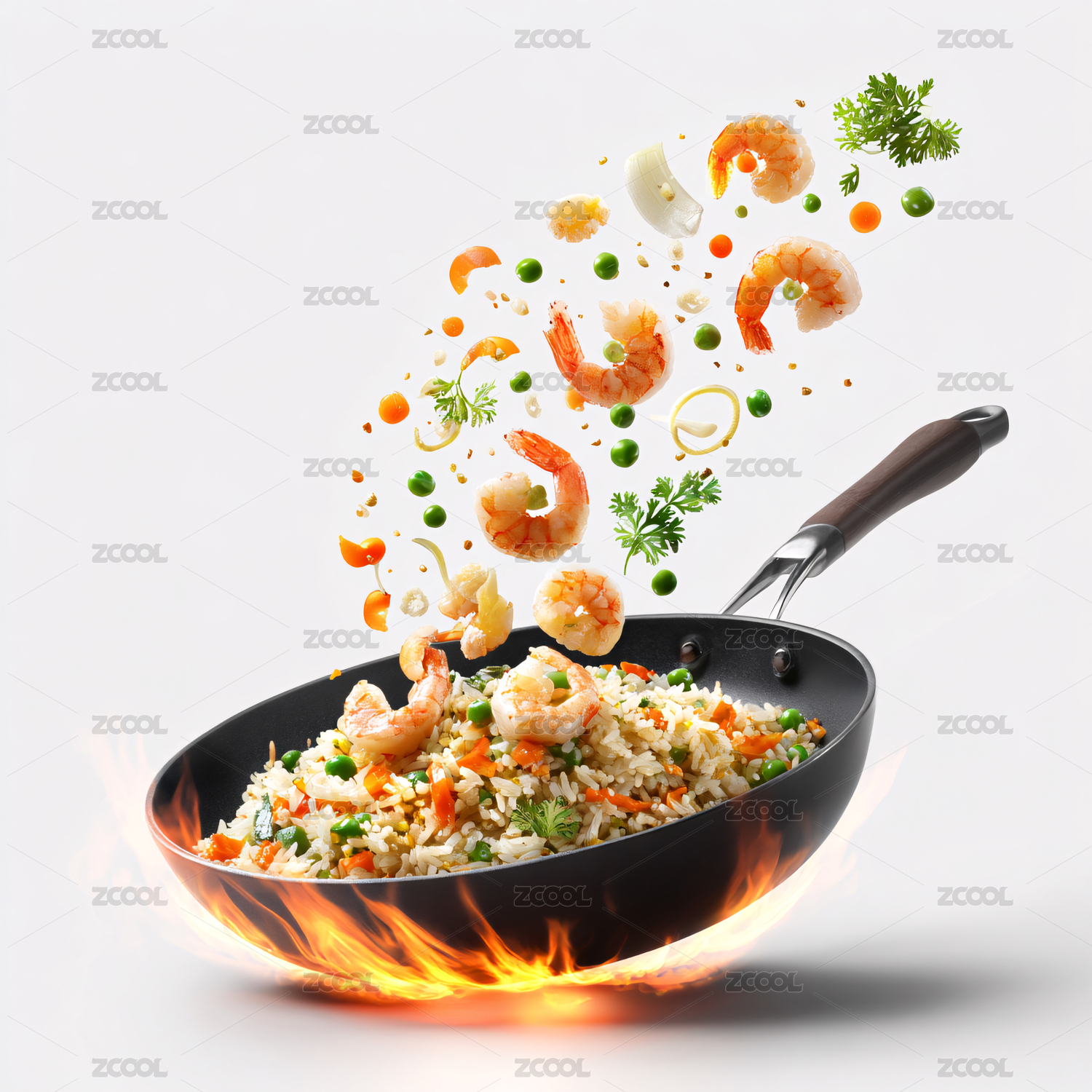 一只装有小龙虾柠檬片西兰花的不锈钢煎锅放在桌面上