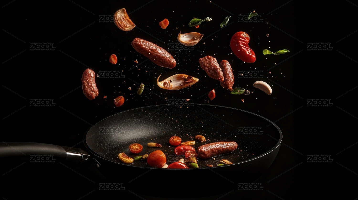 煎好的美味牛排放在煎锅中,旁边还有圣女果