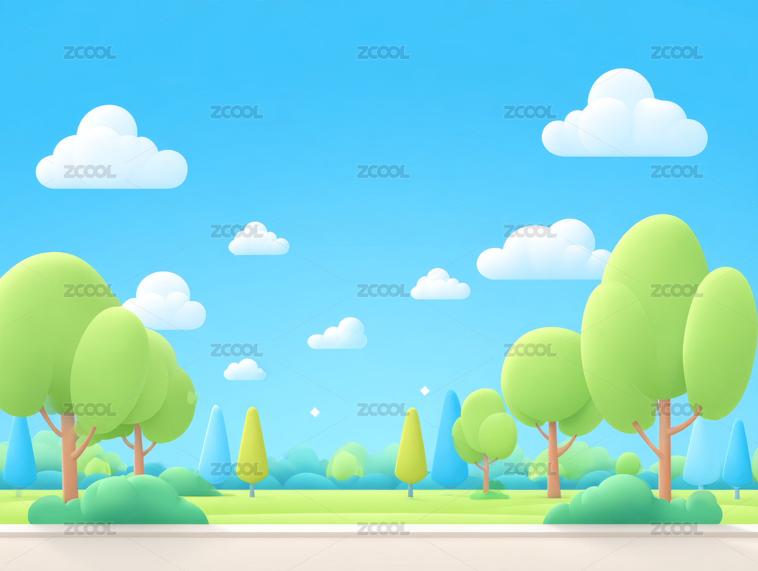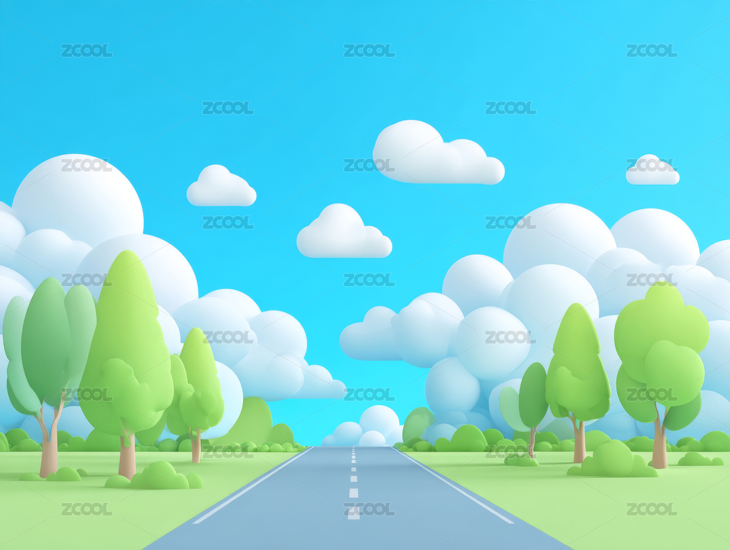 1绿色山坡草地远处是蓝天白云的3D卡通场景