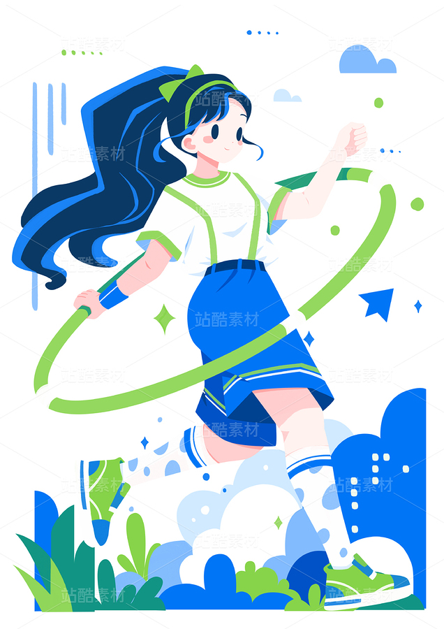 人物运动系列插画,有呼啦圈、滑板、跳绳、旱冰、举重、跑步、骑行、丝带舞、跳绳等