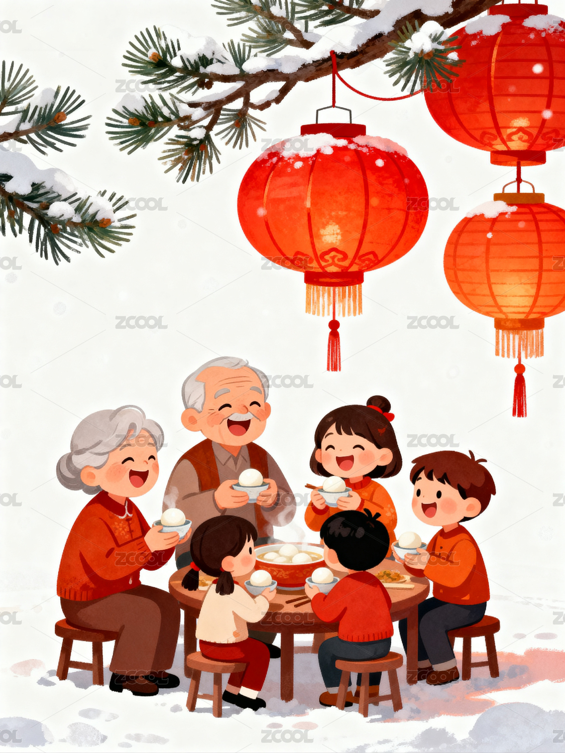 新年一家人在除夕夜吃团圆饭的年俗插画