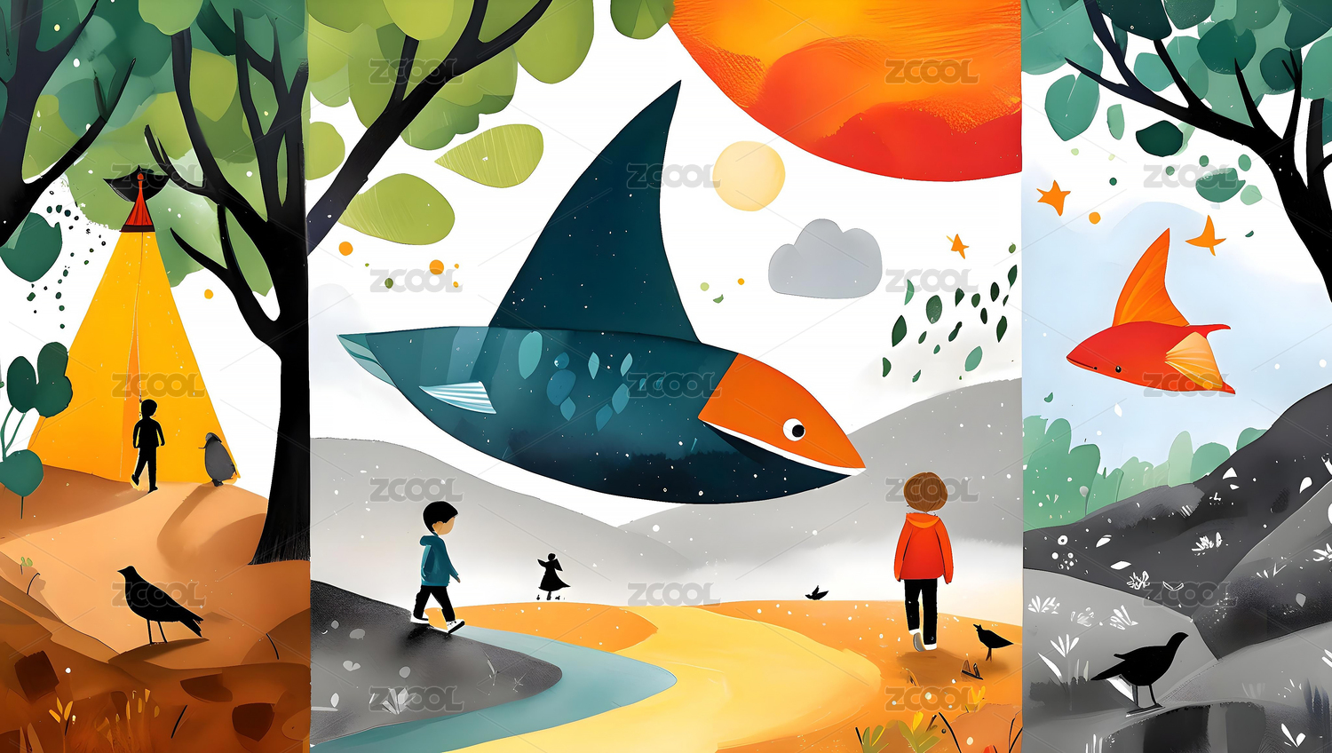 儿童插画绘本手绘风三连画 拥抱自然的孩子