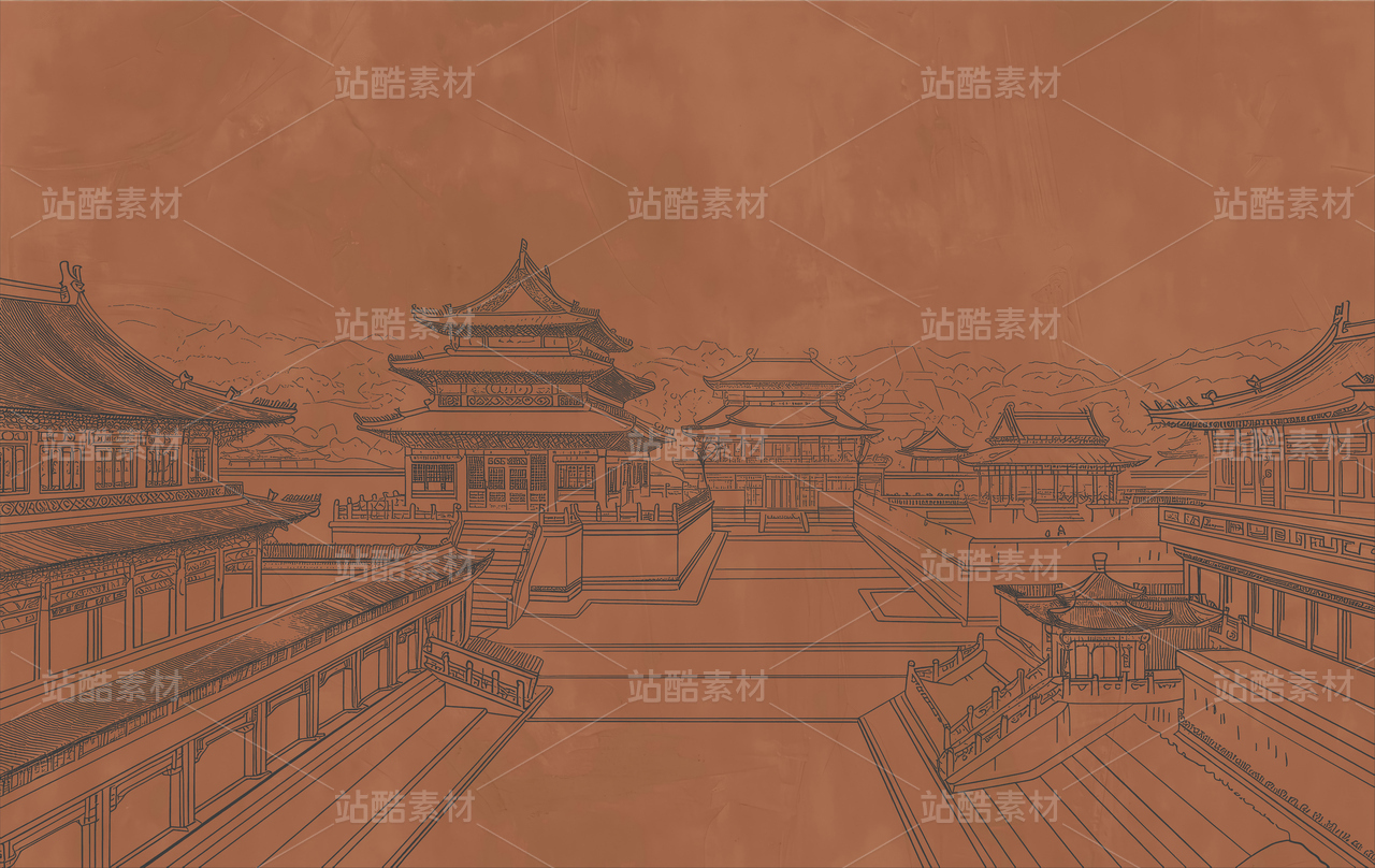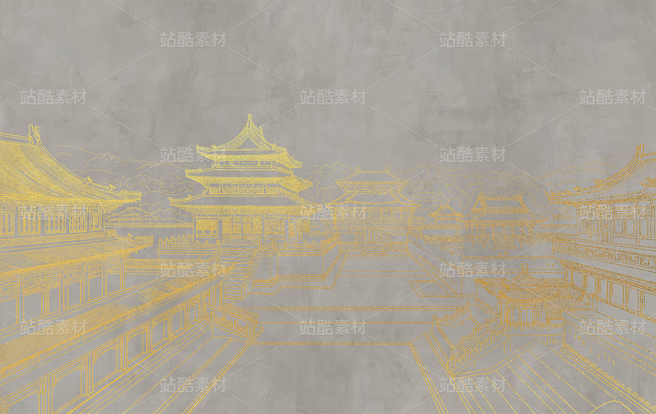 新中式国风亭台楼阁建筑工装背景墙壁画