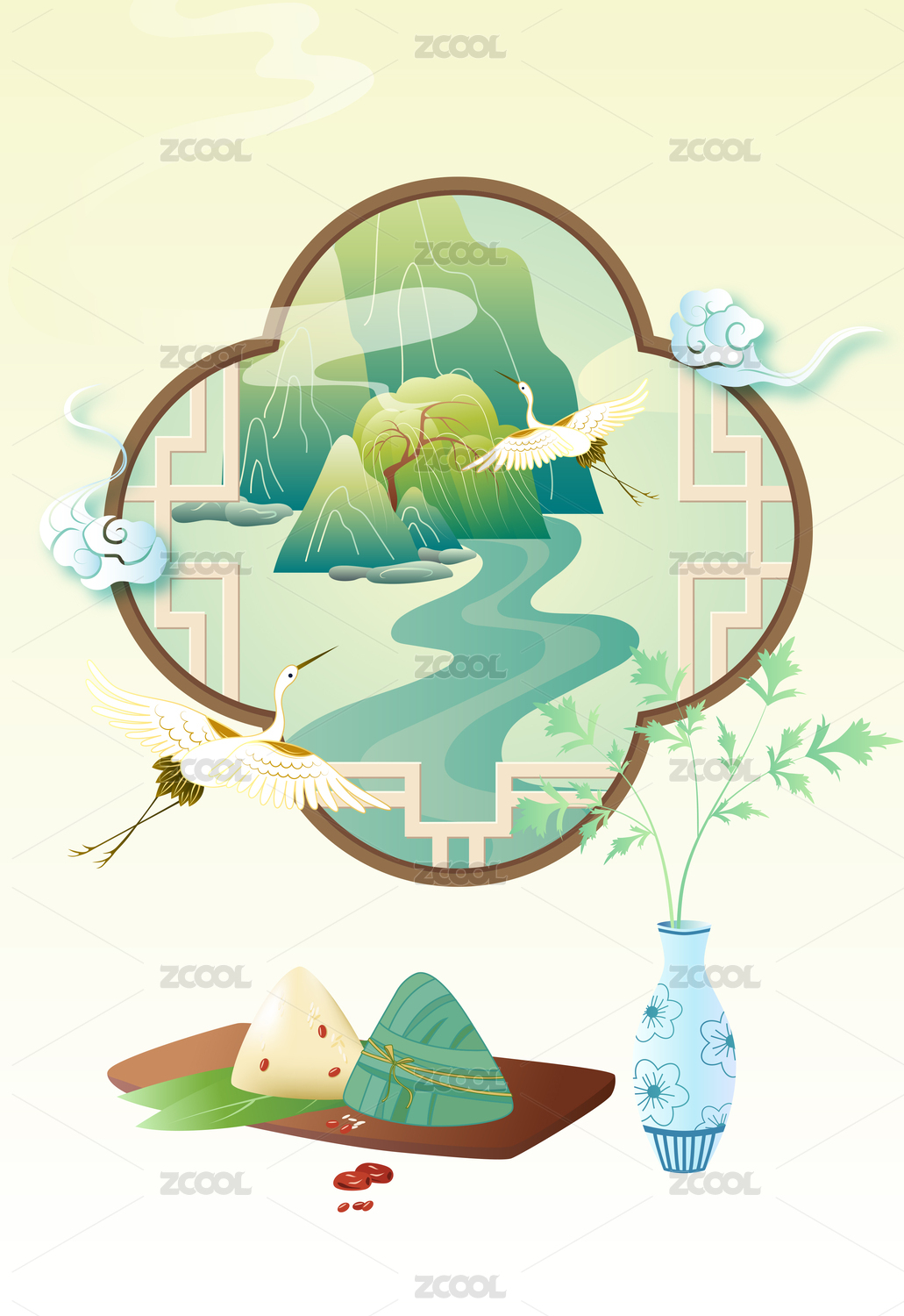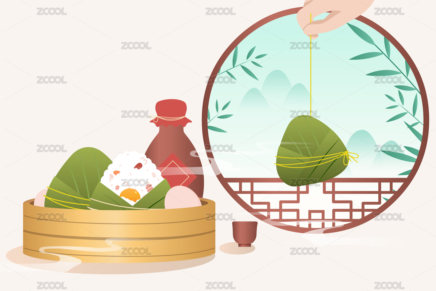 端午节窗边山水美酒粽子糯米古风插画矢量图