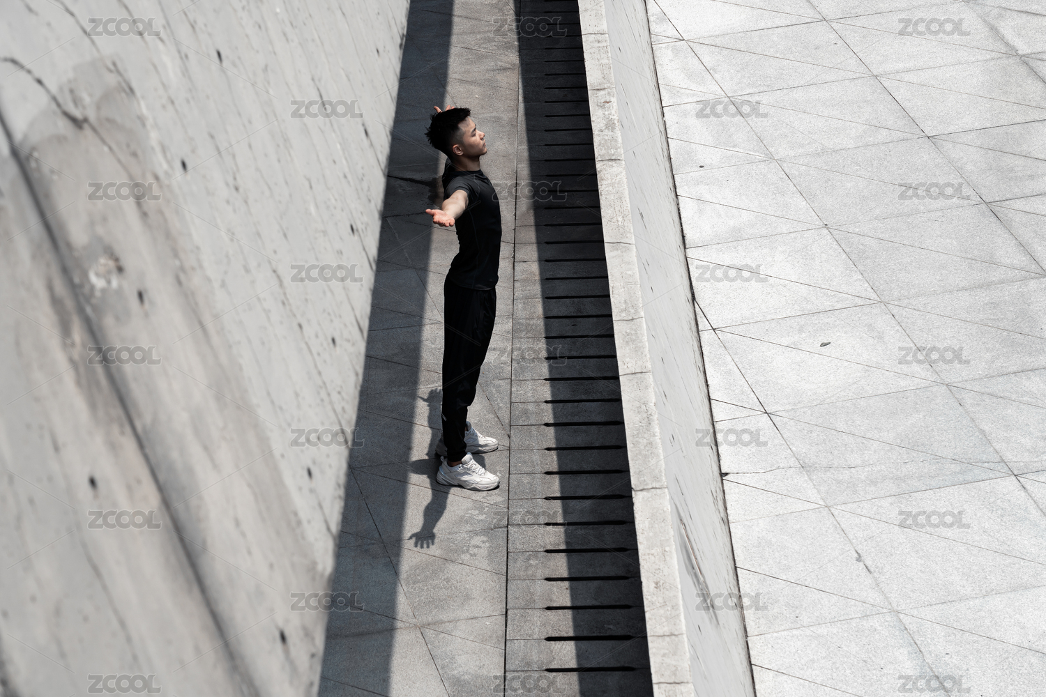 一名年轻的中国男性在城市里锻炼身体做拉伸