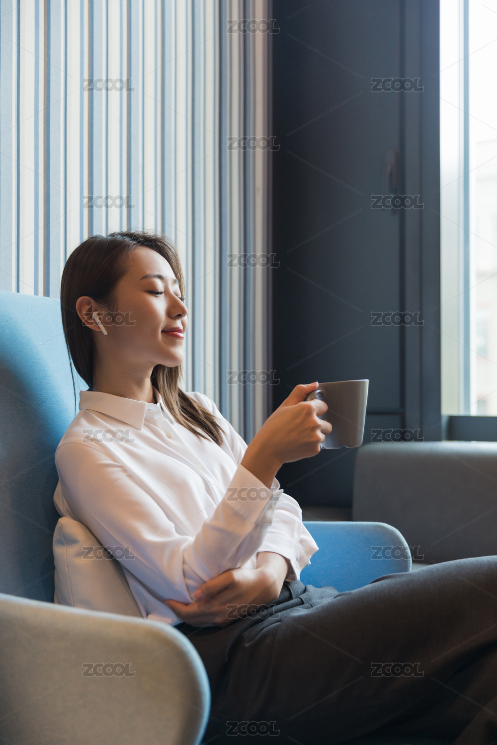 一位职场女性手拿水杯休息听音乐